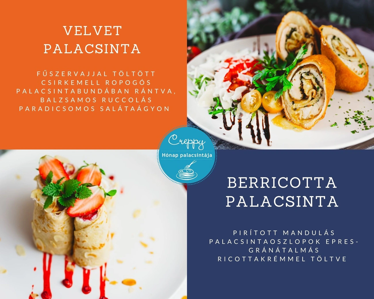 A Creppy főételek seregéhez csatlakozik ebben a hónapban a palacsintabundába hajtott, fűszervajjal áztatott omlós csirkemell balzsamos paradicsomos ruccolás salátaágyon, mely kompozíciónkat Velvet névre kereszteltük el. Egyéni ízvilágával, markáns, mégis elegáns megjelenésével sikerre van ítélve rajongóink körében.