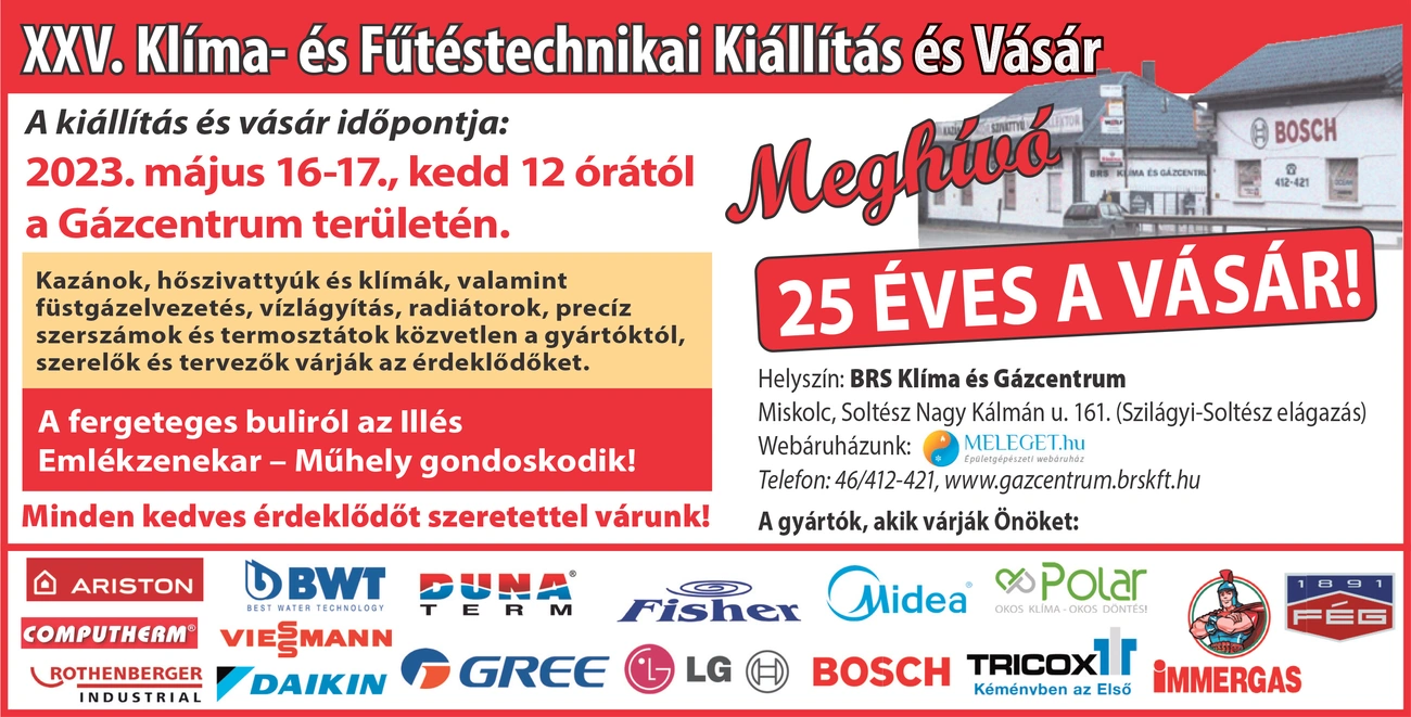 Május 16-án és 17-én rendezik meg a BRS Klíma és Gázcentrumban a XXV. Klíma- és Fűtéstechnikai Kiállítást és Vásárt. (Támogatott tartalom.)