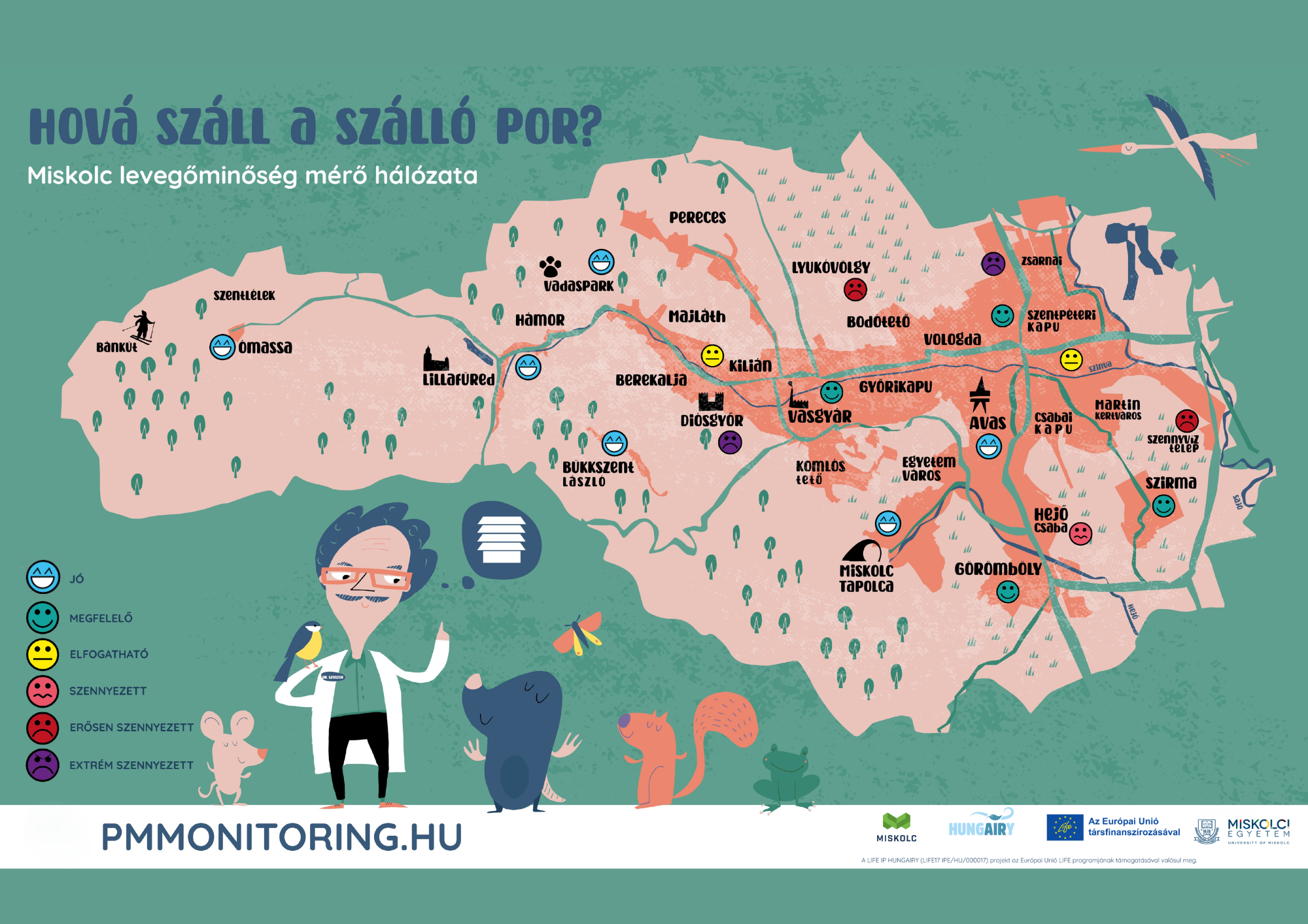 Ahhoz, hogy erről tájékozódhassunk, nem kell hosszú, szakzsargonokkal teli híreket és cikkeket olvasni, a megoldás ott van nálunk, otthon, a munkahelyen, a zsebünkben. Miskolciként már hallhattak a LIFE IP HungAIRy projekt pmmonitoring szállópor mérőhálózatáról, amely a levegőminőség aktuális helyzetéről térképes formában tájékoztat. A térképen elhelyezett emojik egyértelművé teszik környezetünk levegőminőségét, amelyet a MIÓVI Benedek Elek Tagóvodája is aktívan figyel. Tapasztalataikat örömmel megosztották velünk.