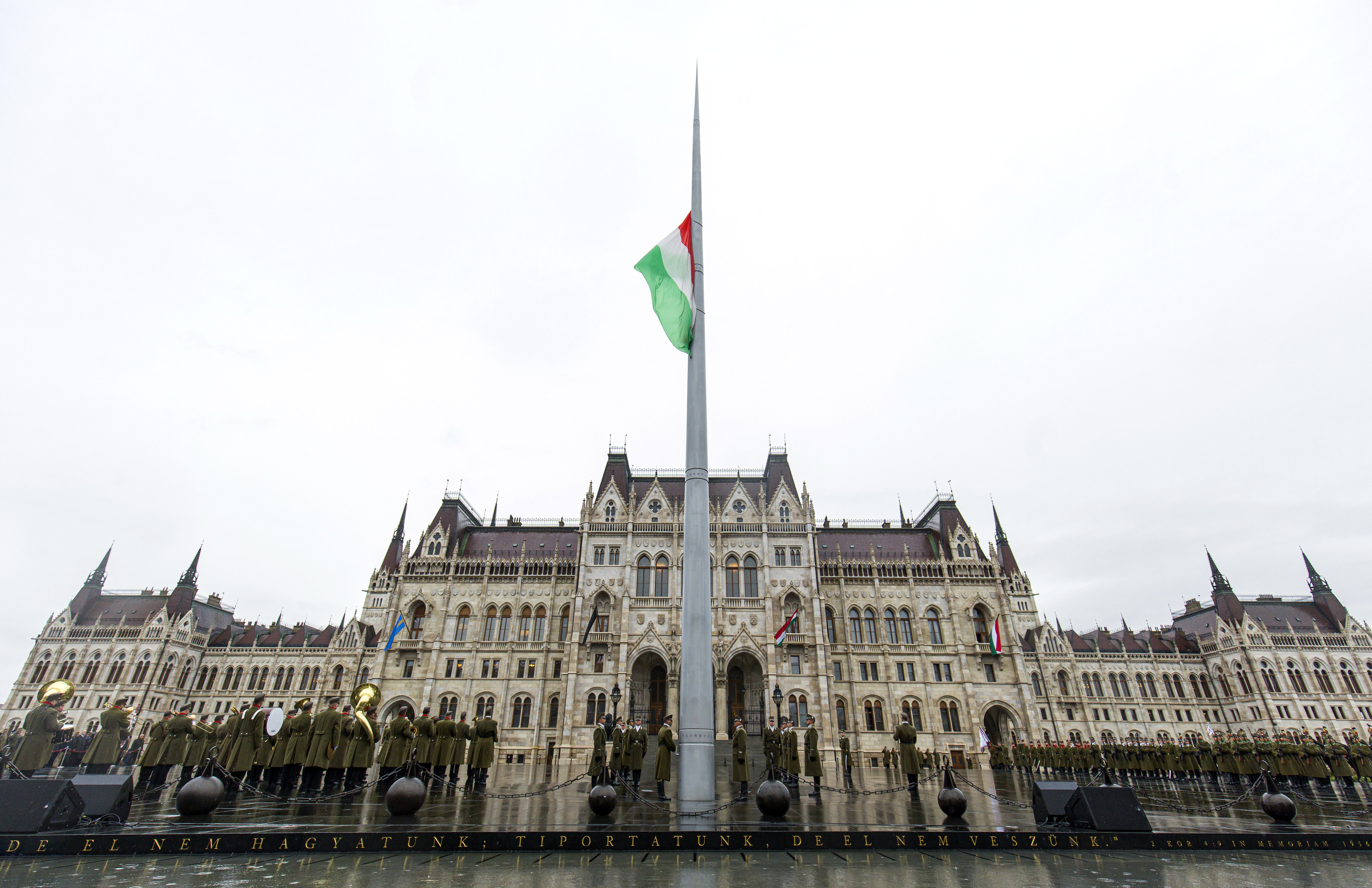 Katonai tiszteletadás mellett Benkő Tibor honvédelmi miniszter jelenlétében felvonták, majd félárbócra engedték Magyarország nemzeti lobogóját az 1956-os forradalom és szabadságharc leverésének 63. évfordulóján, hétfő reggel Budapesten, a Parlament előtti Kossuth Lajos téren. A kegyelet kifejezéseként a lobogó egész nap félárbócon marad a nemzeti gyásznapon.