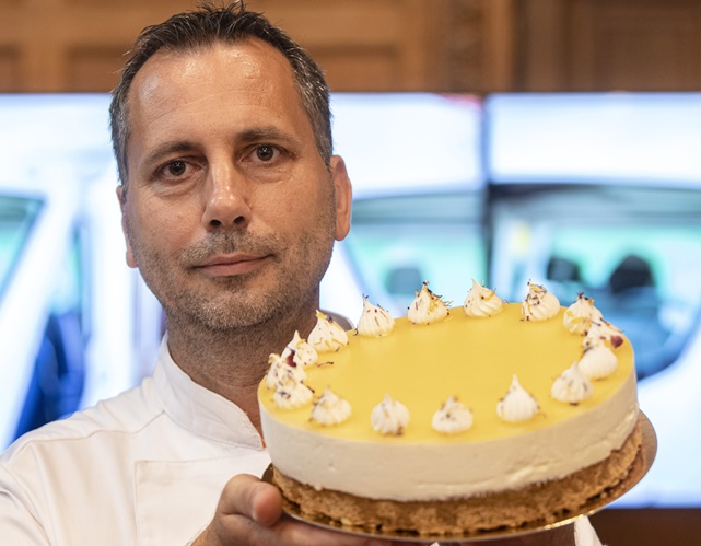 Fodor Sándor, a budapesti Habcsók Cukrászda mestercukrásza a Magyarország tortája címet elnyert Napraforgó nevű tortájával – fotó: MTI