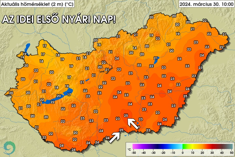 Késő délelőtt a Dél-Alföldön egy-egy meteorológiai mérőállomáson már elérte a hőmérséklet a 25 Celsius-fokot, így idén március 30-án lett meg először a nyári nap - írta a HungaroMet Zrt. a Facebook-oldalán.