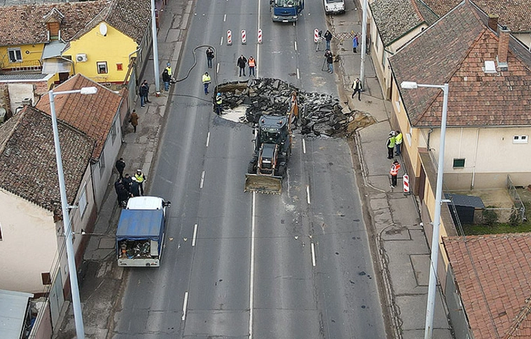 A helyi vízmű munkatársai csőtörés miatt kerítették le a szakaszt, mikor egy érkező BMW alatt beszakadt az aszfalt.