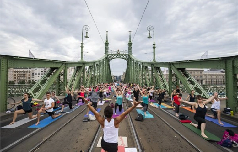 Jógázók a lezárt Szabadság-hídon