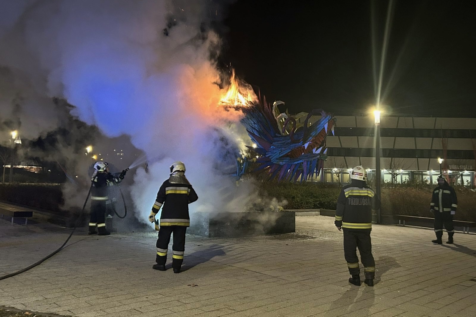 - Hat tűzoltó egy autóval érkezett a helyszínre, kollégáim egy vízsugárral oltották el a tüzet, majd kézi szerszámokkal megbontották a szobrot — nyilatkozta a Kolorline-nak Veres Béla.