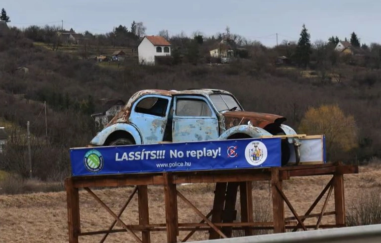A 72. kilométerszelvényben kihelyezett installáció egy emelvényen lévő roncsautó.