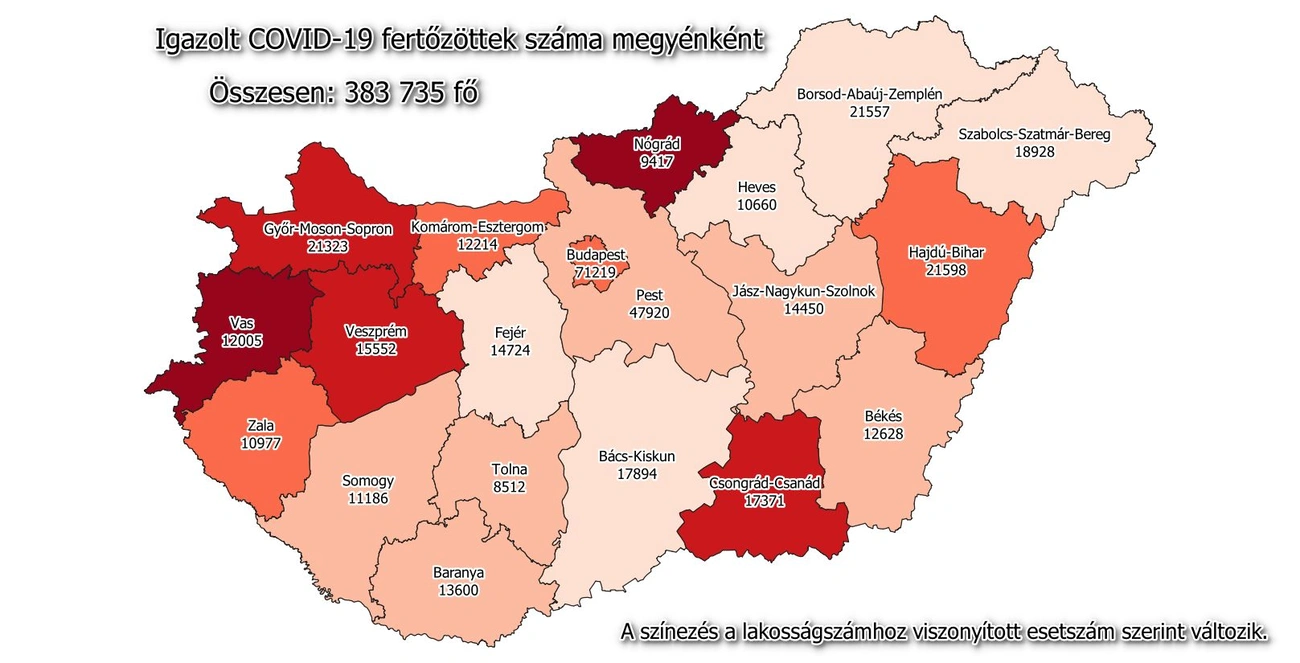 A kormányzati portálon azt írták: 383 735-re nőtt a Magyarországon azonosított fertőzöttek száma. Az elhunytaké 13 543-ra emelkedett, a gyógyultak száma 289 520.