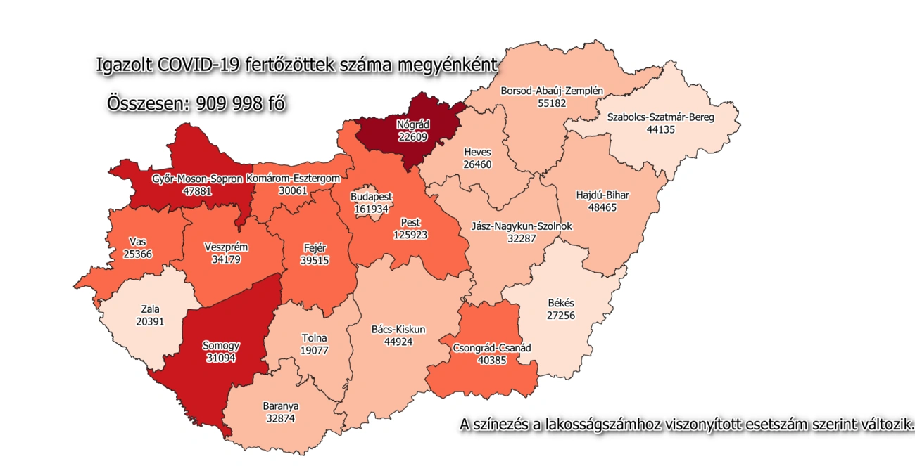 Az oldal térképe szerint eddig Budapesten (161 934) és Pest megyében (125 923) regisztrálták a legtöbb fertőzöttet. Ezt követi Borsod-Abaúj-Zemplén (55 182), Győr-Moson-Sopron (47 881) és Hajdú-Bihar megye (48 465). A fertőzésben legkevésbé érintett megye továbbra is Tolna, 19 077 fertőzöttel.