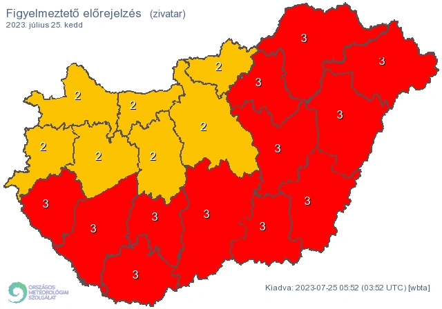 Az Országos Meteorológiai Szolgálat 12 vármegyére adott ki harmadfokú figyelmeztetést keddre, köztük Borsod-Abaúj -Zemplénre, a többiben pedig másodfokú figyelmeztetés van érvényben.