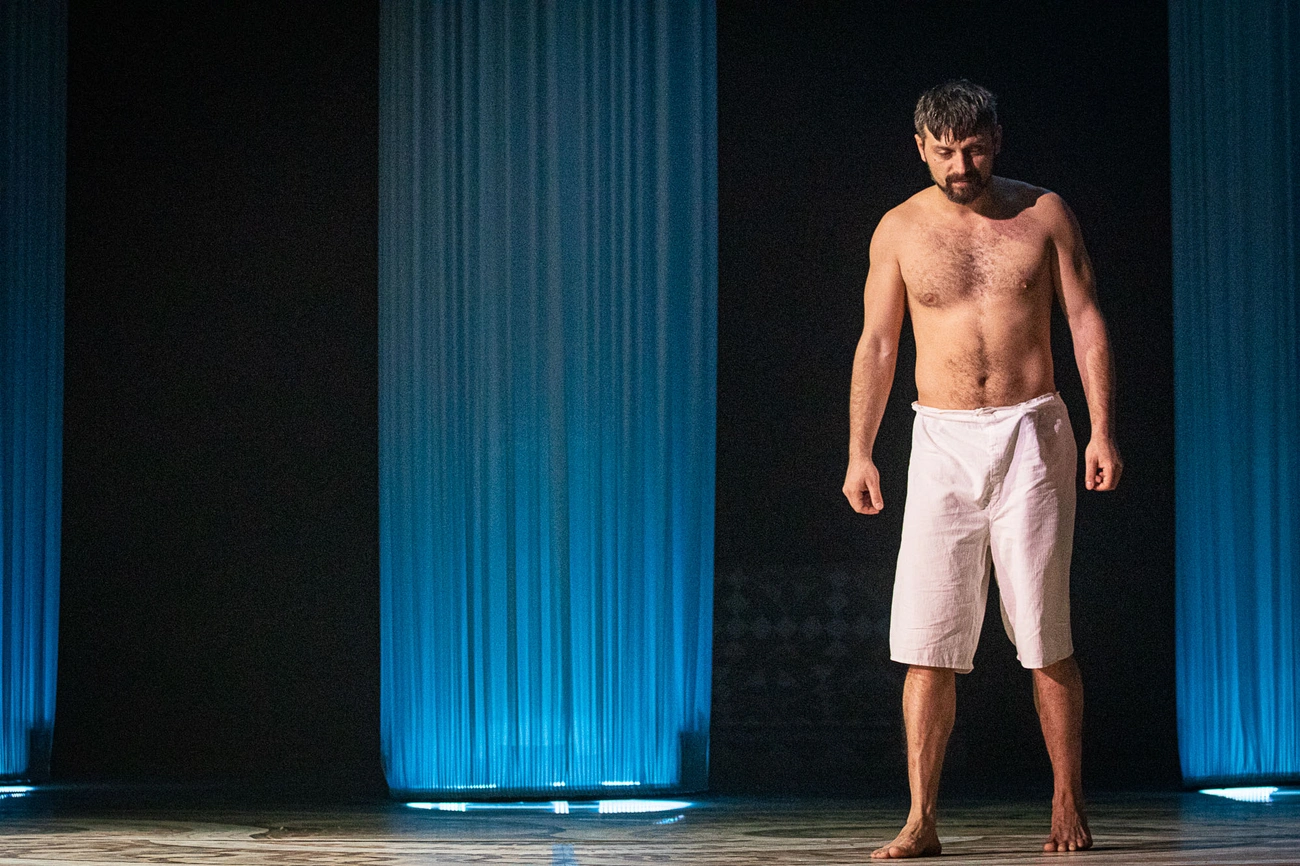 Arra jutottam, hogy nem szabad ollót ragadni, és nem kell nyesegetni a darabot. Szőllősy Klára fordítását felhasználva a regényt színpadra alkalmazó Ari-Nagy Barbara és Szőcs Artur olyan nagyszerűen illesztették saját látomásaikat Bulgakov lázálmai közé, hogy nincs értelme konkolyt keresni. Ez mind búza. A mű tértől és időtől való függetlenségét számos jelenet erősítette: egyszerre volt jelen az ördögöt megszemélyesítő Woland Poncius Pilátus udvarában és beszélgetett a múlt század 20-as éveinek Moszkvájában Hontalan Ivannal és Misa Berliozzal. Az interdimenzionalitás pedig jól állt annak a kontrollált káosznak, amit Bodoky Márk sátánalakja teremtett (igen, itt már kikívánkozik, hogy beszéljek a színészi munkáról, de még tartsuk magunkat kicsit!). Annak ellenére sikerült időtlennek maradnia, hogy számos közéleti utalást tűztek a darabba. Berlioz például csak névben hasonlít egy francia zeneszerzőre, karakterét tekintve inkább más összefüggést teremt PIMasz megjegyzéseivel, mint például azzal, hogy nem szereti a színházat, és az orosz irodalom 80 százalékát kukázná. Végül az ördög iszik a levágott fejéből (nem, még mindig nem beszélünk a színészi játékról). Érdemes szót ejteni az idősíkokat lazán összekötő további kapcsokról. Ilyen például az a zseniális pillanat, ami a Mester és Margarita ikonikus macskáját, Behemótot látja el eredetsztorival (komolyan, egyre nehezebb magamban tartani). Nem lövöm le a poént, de igazán érdekes felvetés született. Ilyen kapocs még Hontalan Iván is, aki egy-egy jelenetben az idő és tér foghézagjába szorul. Oké, nem bírom tovább, jöjjön a színészi munka.