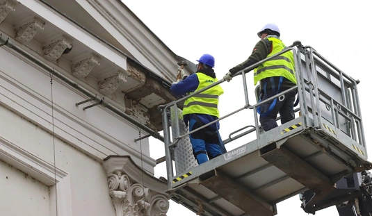 Veszélytelenítési munkálatok a Nagyszínház homlokzatán