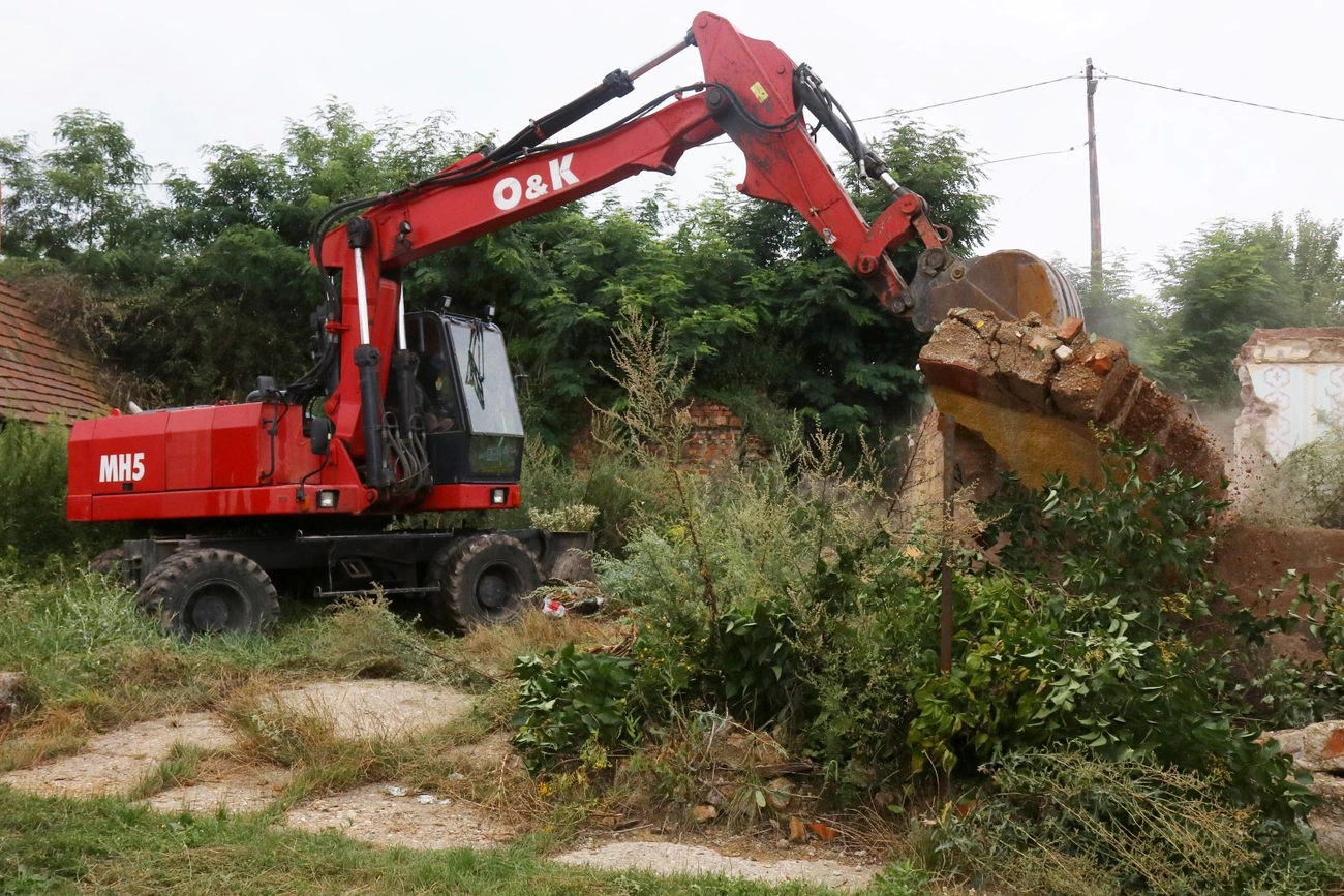 Kutyavonítás kíséri utunkat a sáros utcában. A markológéptől tisztes távolságban gyerekek lesik, mi történik a félig már elbontott-elhordott házzal. A helyszínen megtudjuk: a lakók hónapokkal ezelőtt elhagyták a házat, azóta tokostul-üvegestül eltűntek az ablakok, ajtót se nagyon látni már az önkormányzat által megvásárolt ingatlanban.