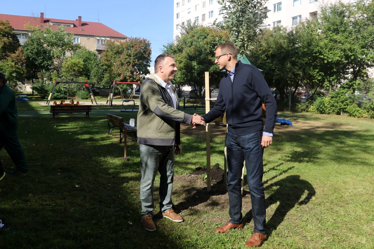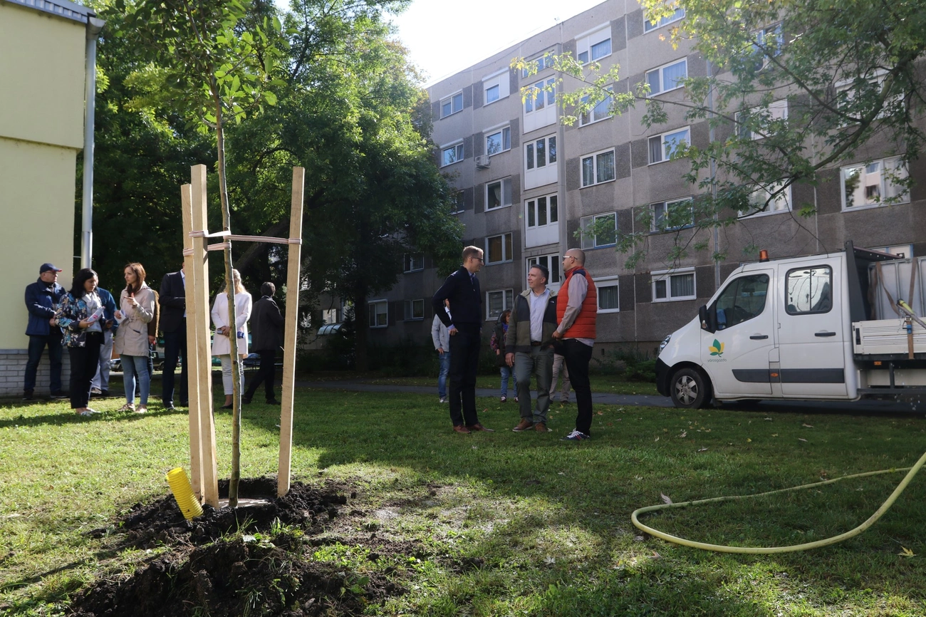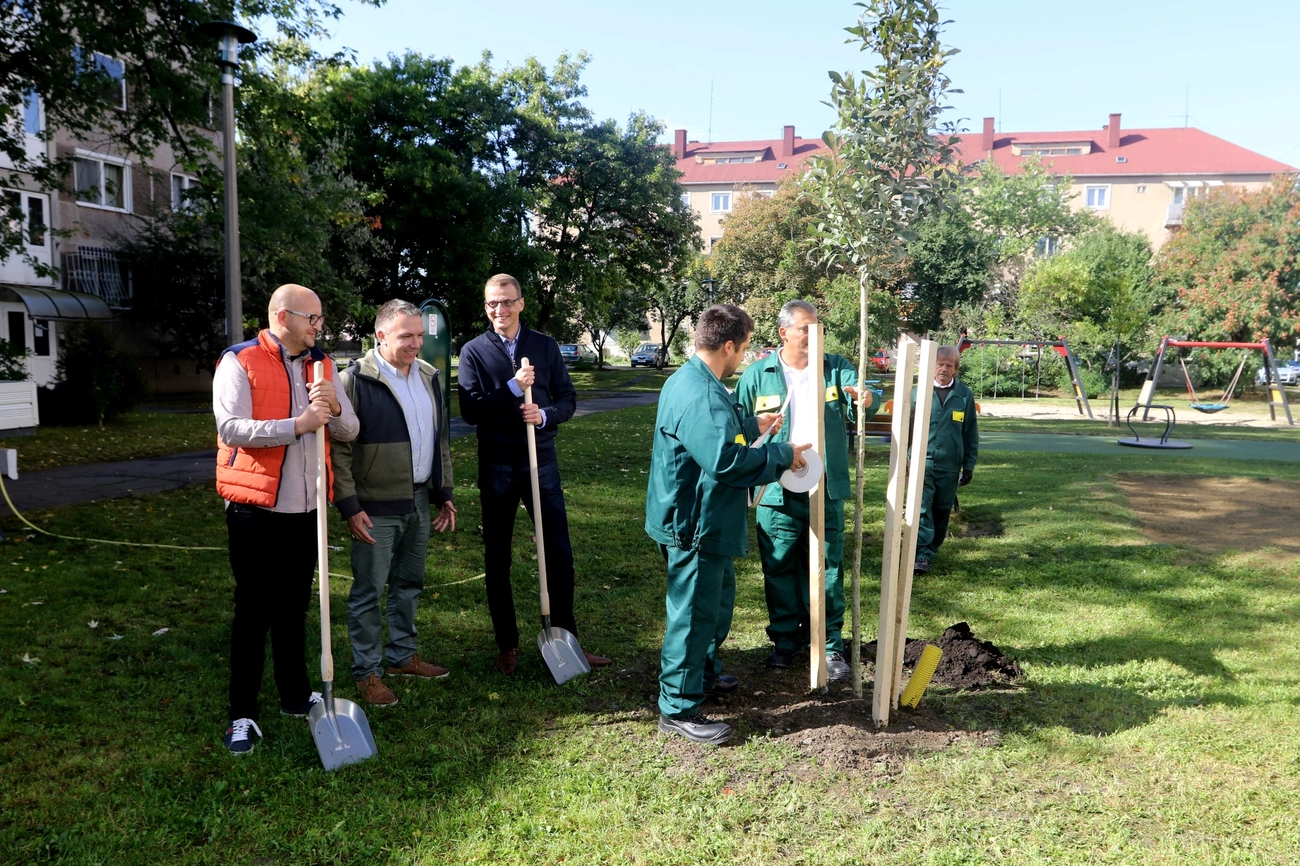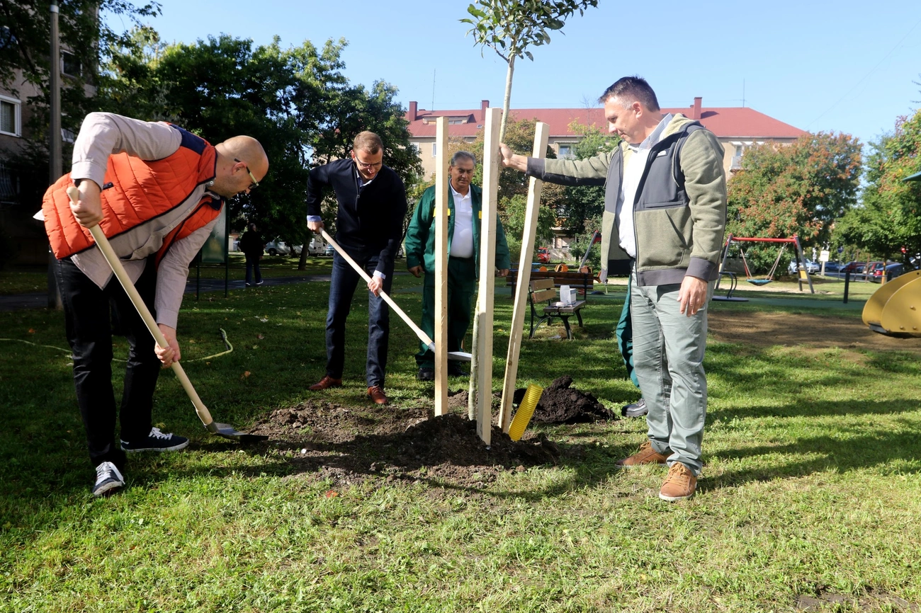 Fát ültetett ma Nagy Ákos önkormányzati képviselő, Alakszai Zoltán jegyző és Szinay Attila államtitkár a Gálffy Ignác és a Géza utca közötti játszótéren. A város vezetése évente 366 millió forintot fordít a zöld területek karbantartására és azt az elvet követik, hogy ha kivágnak egy fát, kettőt ültetnek a helyébe.
