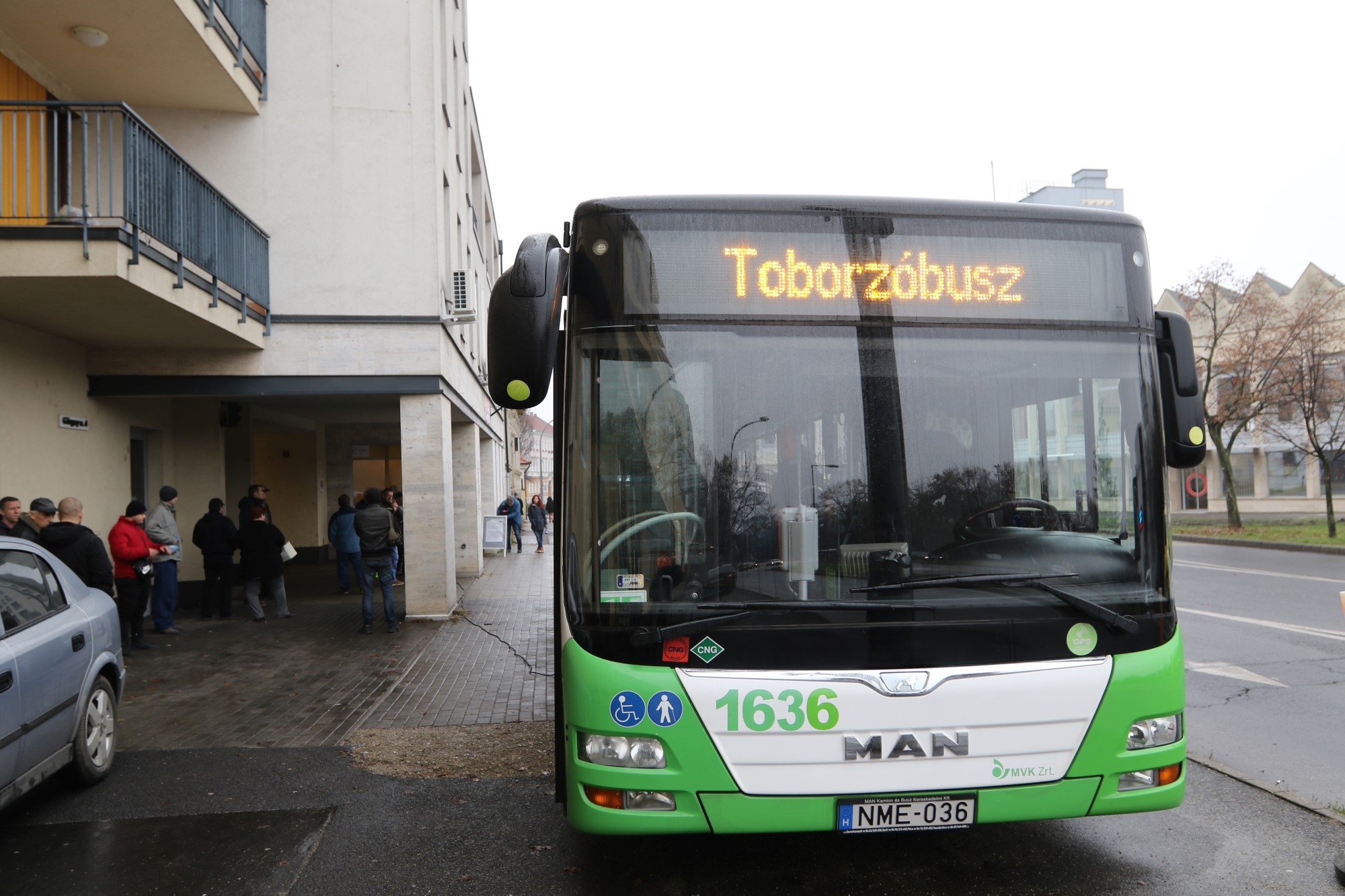Toborzóbusz parkolt a Görgey ház előtt, hogy az érdeklődők közelebbről is nyugodtan meg tudják nézni az MVK CNG járművét. A buszsofőr toborzóra már nyitás előtt sokan érkeztek.
