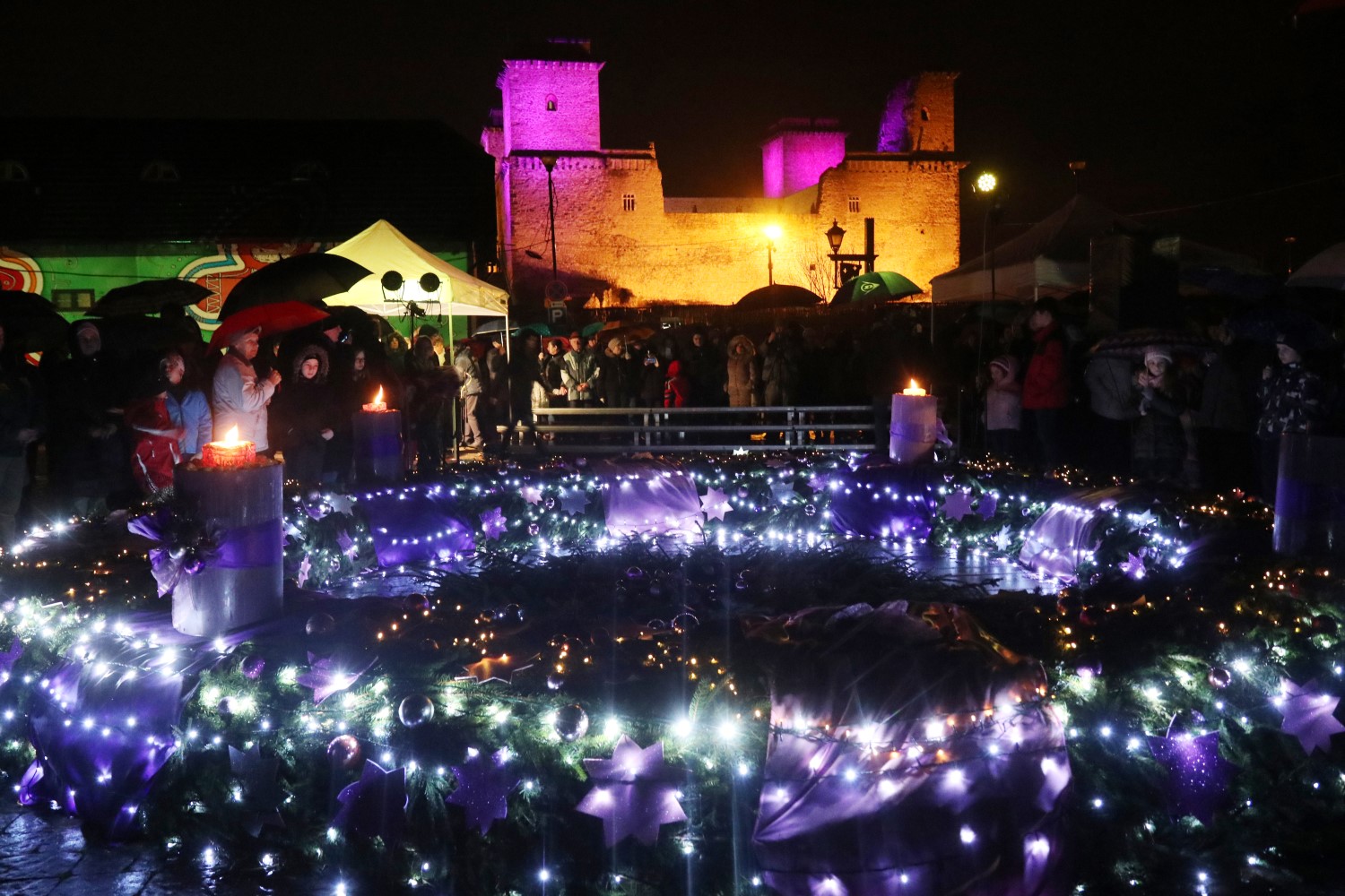 A hatalmas adventi koszorún hétről hétre újabb gyertya jelzi a karácsony közeledtét. A Diósgyőri vár bástyái fényárban úsznak.