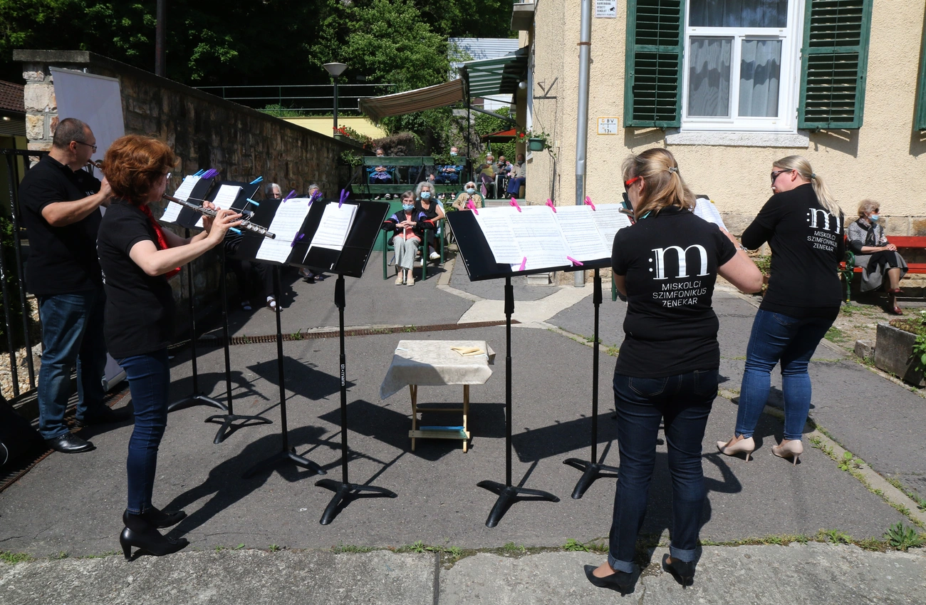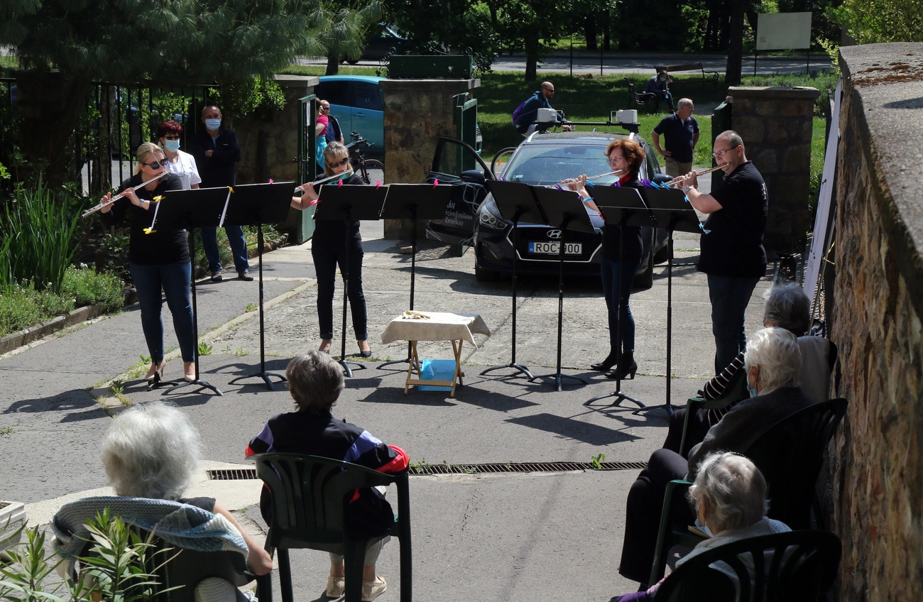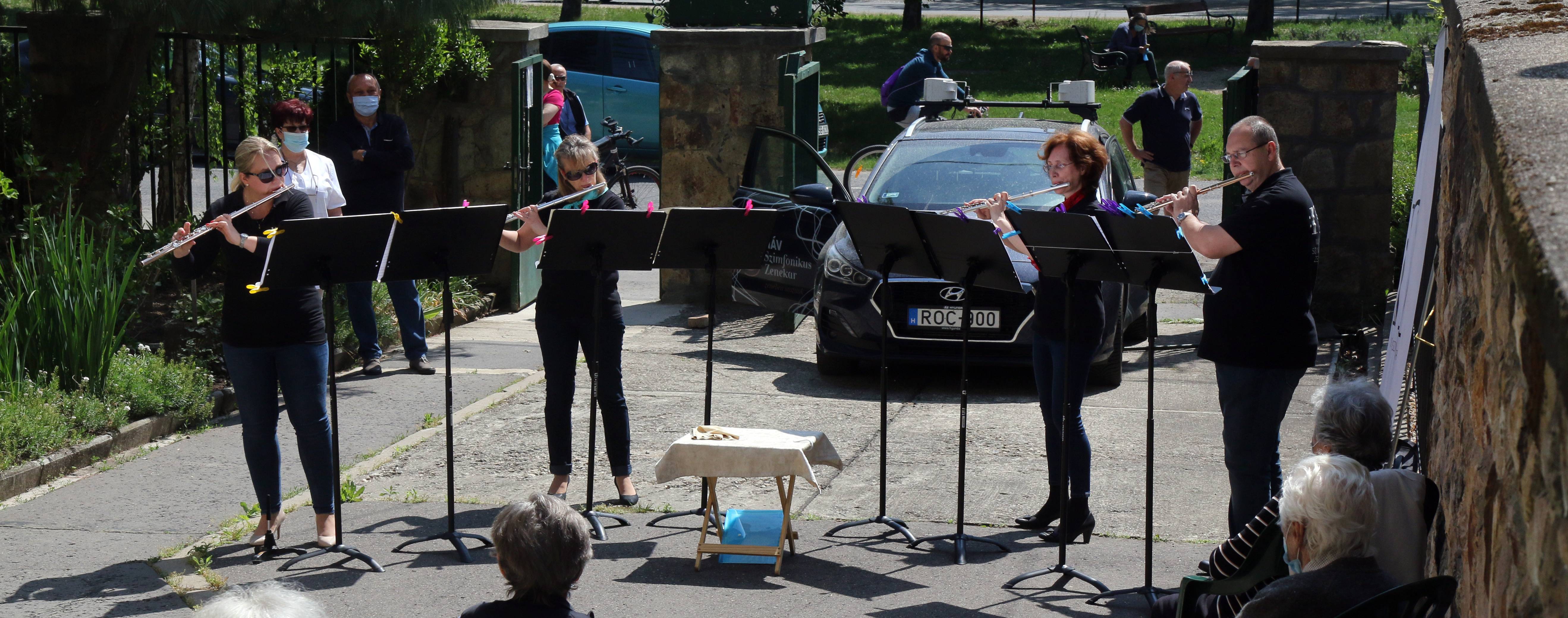Fuvolán játszottak a Miskolci Szimfonikus Zenekar tagjai a MÁV Szimfonikus Zenekar Nyiss ablakot a zenének! elnevezésű programsorozata keretében Miskolcon, a Napház Gondozó Centrum Idősek Otthona lakóinak az intézmény előtt szombaton. A miskolci zenekar egy kamaraformációval, fuvolakvartettel csatlakozott a MÁV szimfonikusok zenés akciójához, így az érdeklődők a kiérkező autó hangszóróiból szóló komolyzenét és az élőzenét is hallgathatták.