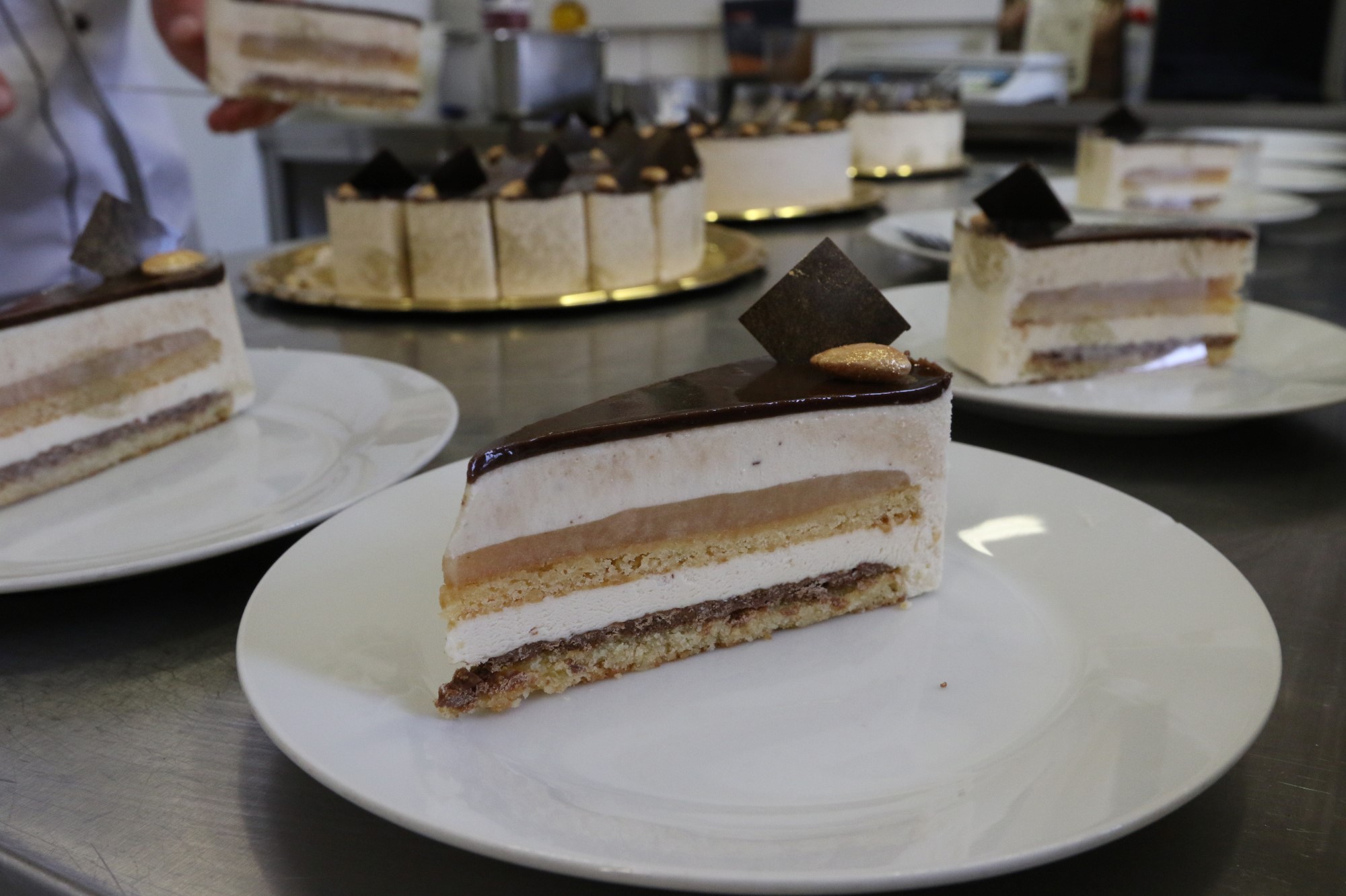 A mestercukrász szerint az idei év tortája azért különleges, mert a gyümölcsbetét birsalmából van, ami megosztja az emberek ízlését. – Van, aki nagyon szereti, más meg egyáltalán nem. Ehhez és a piskótalapokhoz társul még egy ropogós réteg, ami már negyedik éve jellemzője az országtortáknak. Az ideiben könnyű krém van, ami nem teszi nagyon édessé. És hogy mik az összetevői? A teljesség igénye nélkül mandula, mandulapaszta, törökmogyoró, zsíros tészta, szárított ostya, birsalmapüré, tojás, fehércsokoládé, sűrített tej, glükózszirup, kristálycukor, étcsokoládé és festék az arany színű mandulához. A bonyolultságát az adja, hogy sok mindent főzni kell benne és mindezt lehűteni. Az összerakása díszítéssel, szeleteléssel együtt már csak fél órát vesz igénybe – mondta Horváth Zsolt, aki bevallása szerint naponta hetven-nyolcvan darabot is elkészít.