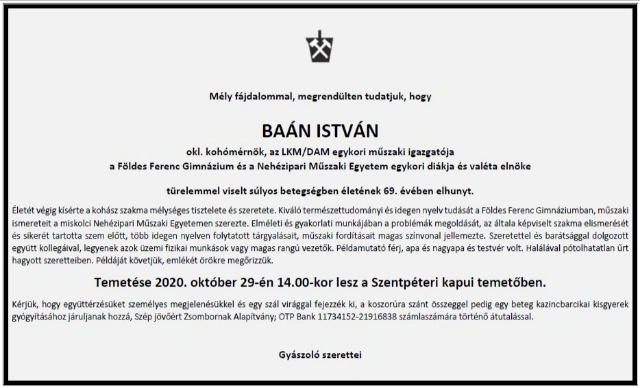 Rendkívüli lelkierővel és türelemmel viselt súlyos betegséget követően október 18-án, életének 69. évében elhunyt Baán István okleveles kohómérnök, az LKM/DAM egykori műszaki igazgatója.