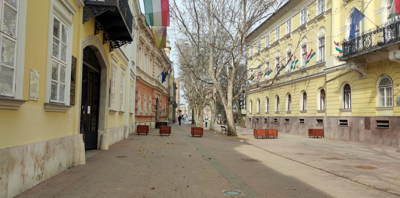 Pár perc telik el, egyetlen ember lép ki a Megyeháza kapuján, vele szemben a Városházáén egy sem: ügyfél vajon, vagy dolgozó? Persze, az ügyfélfogadás szinte mindenhol és minden ügyben szünetel, mióta karanténhelyzet van ismét. Kihalt a város, szürke és csendes.