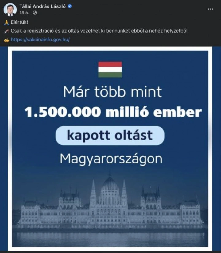 Vélhetően afeletti örömének szeretett volna hangot adni a borsodi politikus, hogy szombatra Magyarországon a beoltott emberek száma átlépte a másfél milliót, azonban elrontotta a nagyságrendet. Az általa írt szám alapján ugyanis a Föld teljes népességének kétszázszorosa kapott volna már az itthon beszerzett vakcinából.