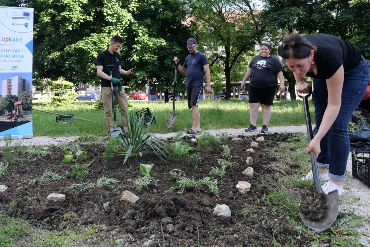 A Háromkő Egyesület a Jókai utca 17. szám előtt a kavicsos út mellett, a szalonnasütőnél található kiskertet tette rendbe.