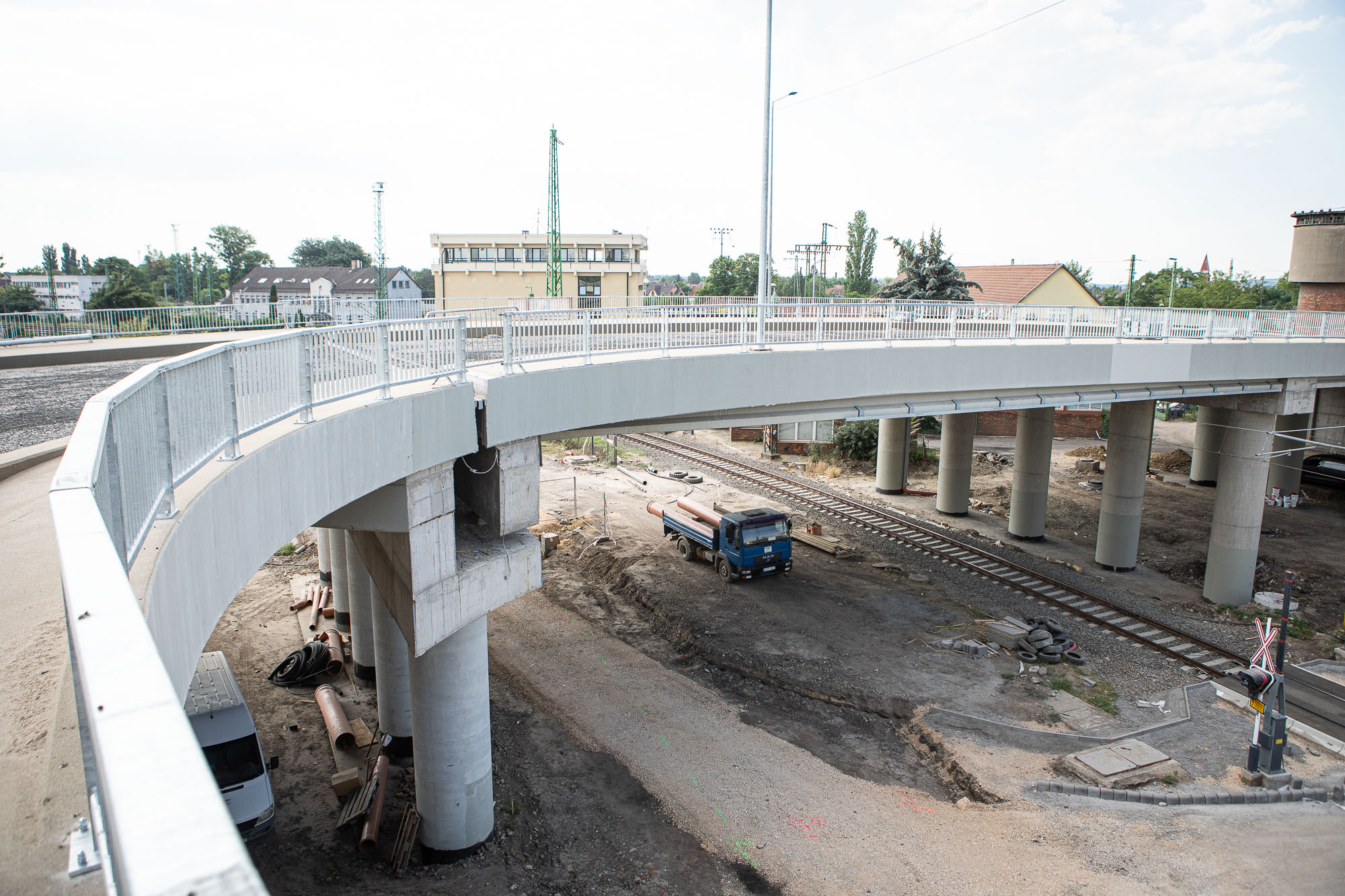 A hídon 5-6 percenként járnak oda-vissza a kamionok, egyéb, az építkezésnél használt járművek. Aszfalt fedi már az utat, jól kivehető az Y-forma központi magja is - itt válik ketté az út. A Tiszai pályaudvar felé haladó ággal ránézésre is jobban haladtak, mint a Martin-kertváros felé forduló ággal.