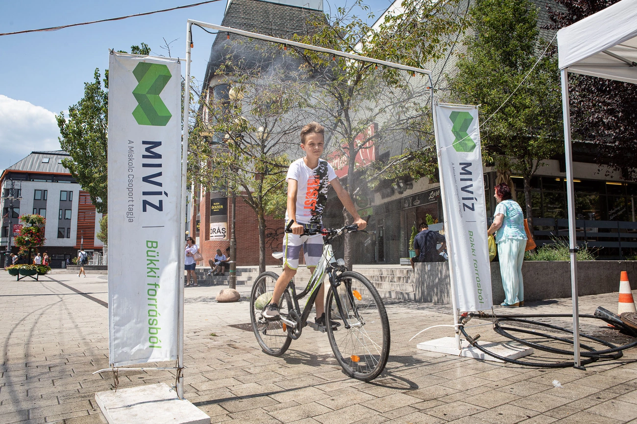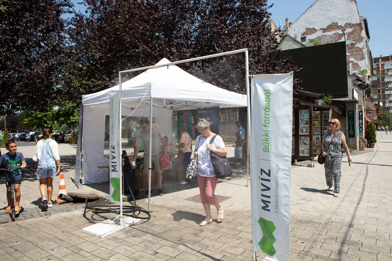 A MIVÍZ a város forgalmas csomópontjain idén is vízosztással és párakapukkal igyekszik enyhíteni a miskolciak hőségérzetét. A Villanyrendőrnél, a Centrum Áruháznál és az Újgyőri főtéren vannak kitelepülések. Viszokai János műszaki igazgató a Miskolc Ma stábjának elmondta, minden nap 11 és 15:30 közötti időszakban történik a vízosztás a legmelegebb időszakban.