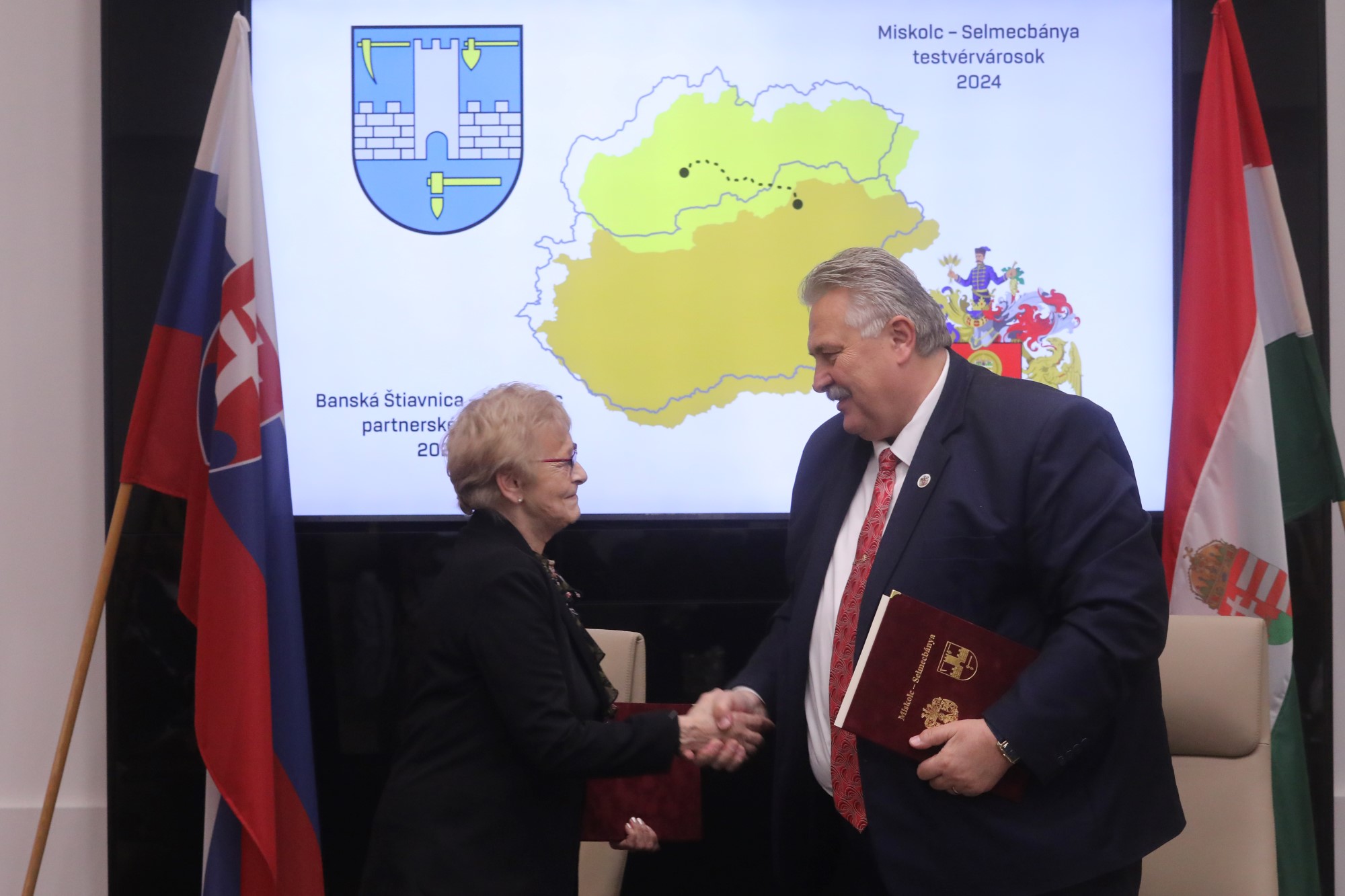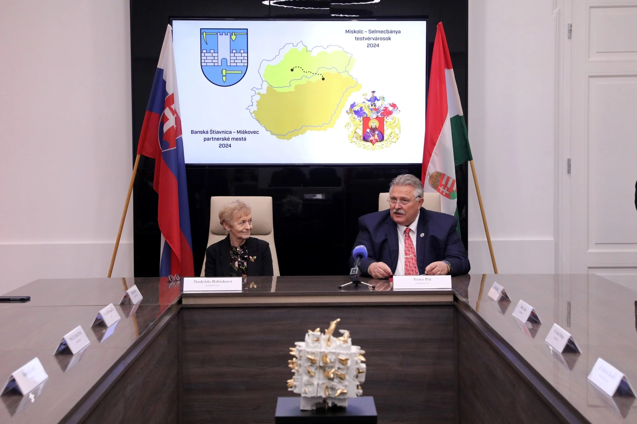 Hivatalosan is egymás testvérvárosa lett Miskolc és Selmecbánya, az erről szóló kétoldalú megállapodást pénteken délelőtt írták alá Veres Pál és Nadežda Babiaková polgármesterek a miskolci városházán. Ahogyan arról korábban beszámoltunk, a két város együttműködéséről szóló előterjesztést még február végén egyhangúlag fogadta el a miskolci közgyűlés. Az aláírást megelőző köszöntők során kiderült, a selmecbányai testület is hasonlóan döntött, mikor az újabb nemzetközi együttműködésről határozott.