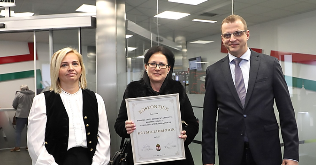 Alakszai Zoltán Borsod-Abaúj-Zemplén vármegyei főispán egy bekeretezett oklevéllel kedveskedett a jeles ügyfélnek, amelyen a főispán aláírása mellett Navracsics Tibor közigazgatási és területfejlesztési miniszter szignója is szerepel. A főispán elmondta, a Borsod-Abaúj-Zemplén Vármegyei Kormányhivatal miskolci járási hivatalának keretén belül működnek a miskolci kormányablakok is, összesen négy, amelyeknek ügyfélforgalma - a nyilvántartásuk alapján - hétfőn érte el a kétmilliót.