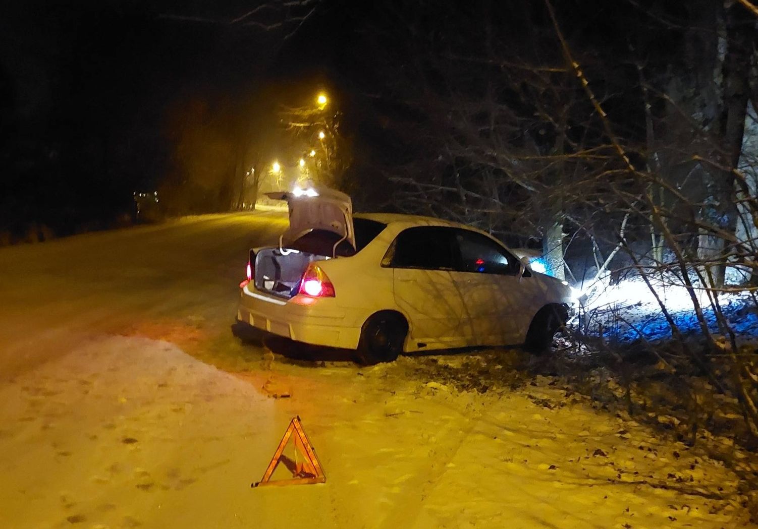 A személygépkocsi valószínűleg a havas úton megcsúszott, és az úttestről lesodródva a fák közé került.
