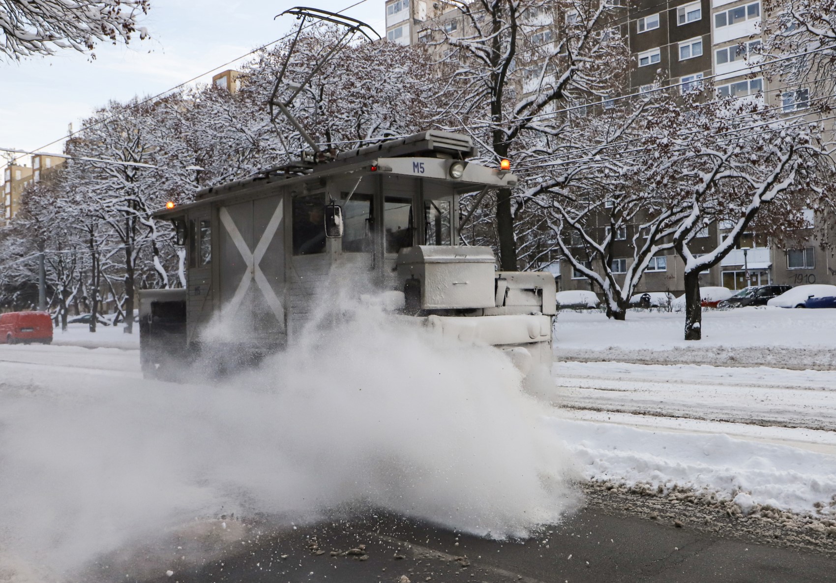 Az M5-ös hóseprő egyébként eredetileg tehervillamosnak készült, még daru is működött rajta. Egészen 53 éven át töltötte be ezt a funkciót, majd átépítették: erősebb motorokat és elülső lapátokat kapott.