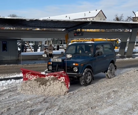A Miskolcon található Búza téri buszpályaudvaron készült az alábbi videó. Egy speciálisan felszerelt Lada Nivát látunk közeledni, a szériaváltozatnál jóval nagyobb kerekekkel, sárga villogóval a tetején – és az orrán egy hatalmas hóekével.