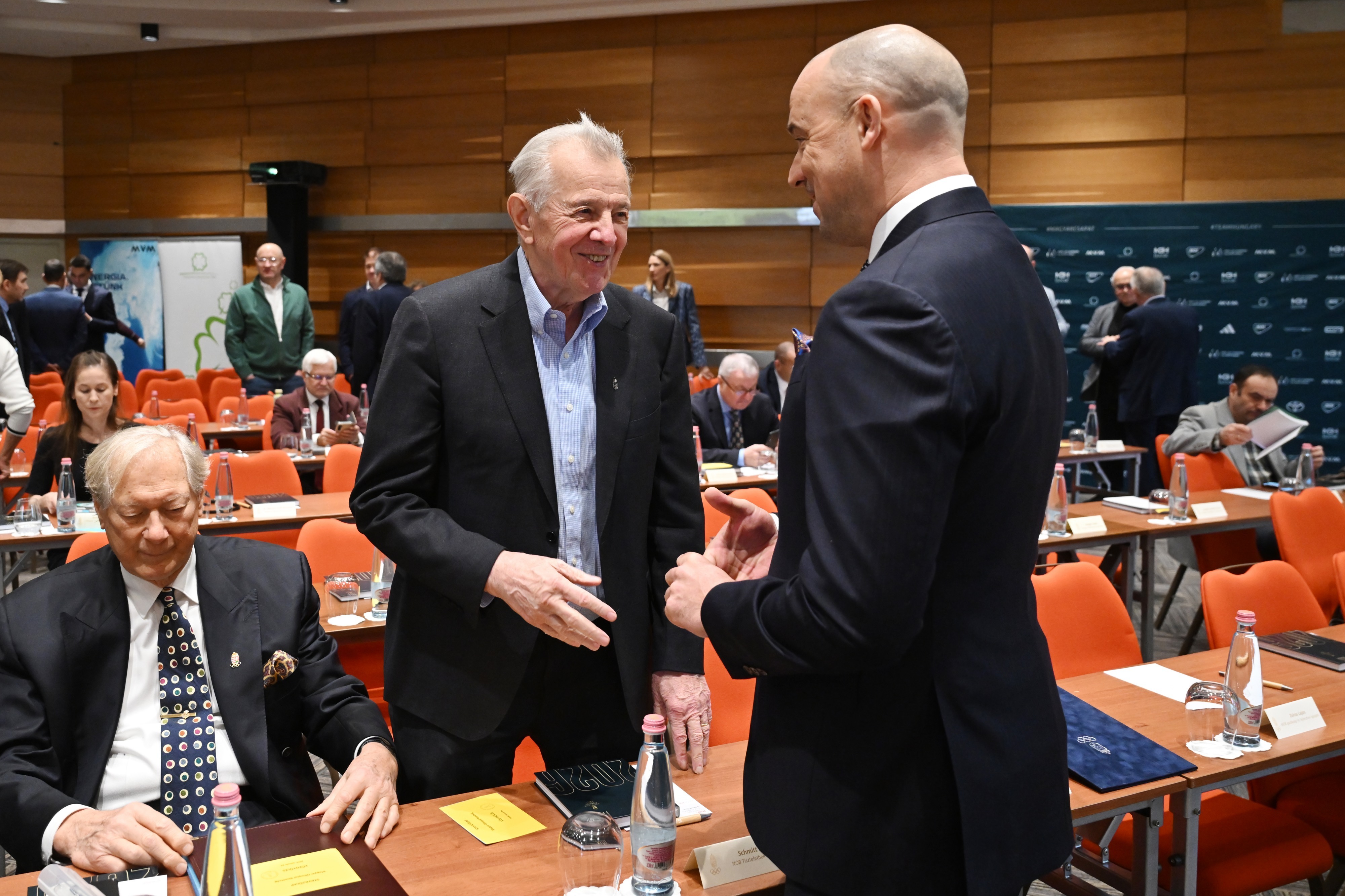 Schmitt Pál (középen) és Schmidt Ádám (jobbról) a honi ötkarikás szervezet közgyűlésén. Fotó: MOB/Szalmás Péter