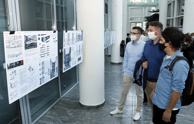 A városháza aulájában hét ifjú miskolci építész formabontó elképzelései láthatóak.