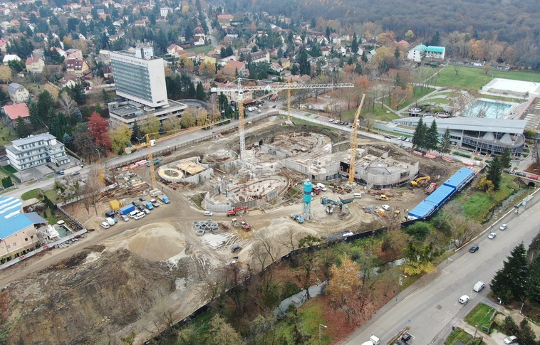 Nagy erőkkel folynak a munkák a Tapolcai Strand II. ütemének beruházásán. A kivitelező a még gyorsabb munkavégzés érdekében a napokban egy ötödik toronydarut is bevont a helyszínen. Amíg az időjárás engedi, a különféle vasbeton szerkezetek kivitelét végzik.