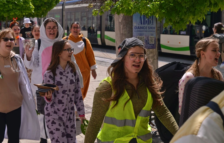 Énekelve, viccelődve, verselve és zenélve vonultak végig a pizsamába és bohócruhába öltözött diákok Miskolc főutcáján pénteken.