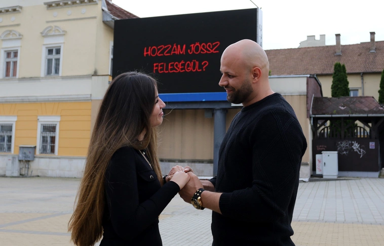 Mihály Norbert a téren álló ledfalat is segítségül hívta, hogy megkérhesse szerelmének, Faragó Zsanettnek a kezét.