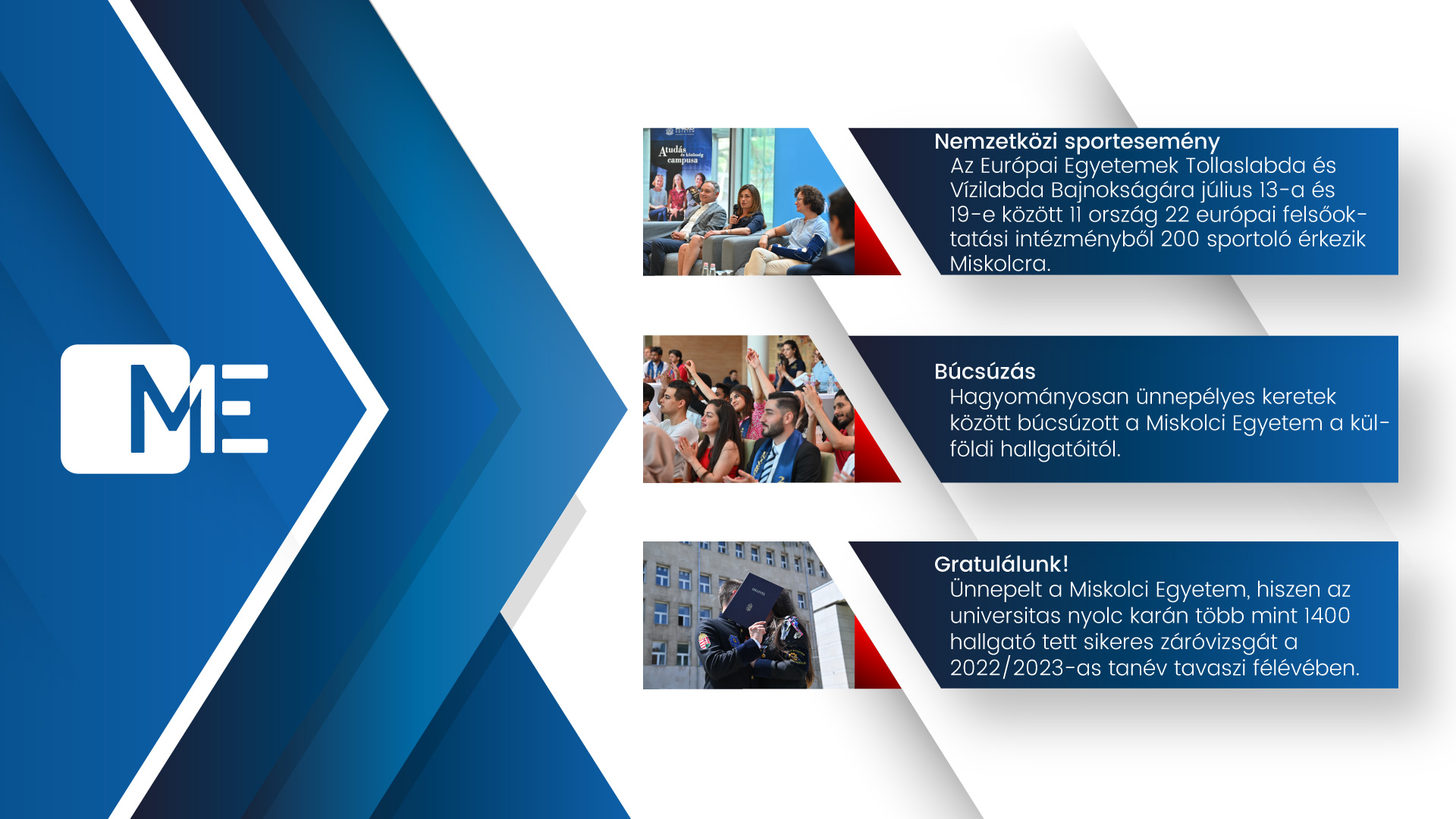 Gratulálunk! Ünnepelt a Miskolci Egyetem, hiszen az universitas nyolc karán több mint 1400 hallgató tett sikeres záróvizsgát a 2022/2023-as tanév tavaszi félévében. Bölcs gondolatokkal a karok dékánjai, vállalatvezetők és közéleti szereplők indították útjukra a fiatalokat.