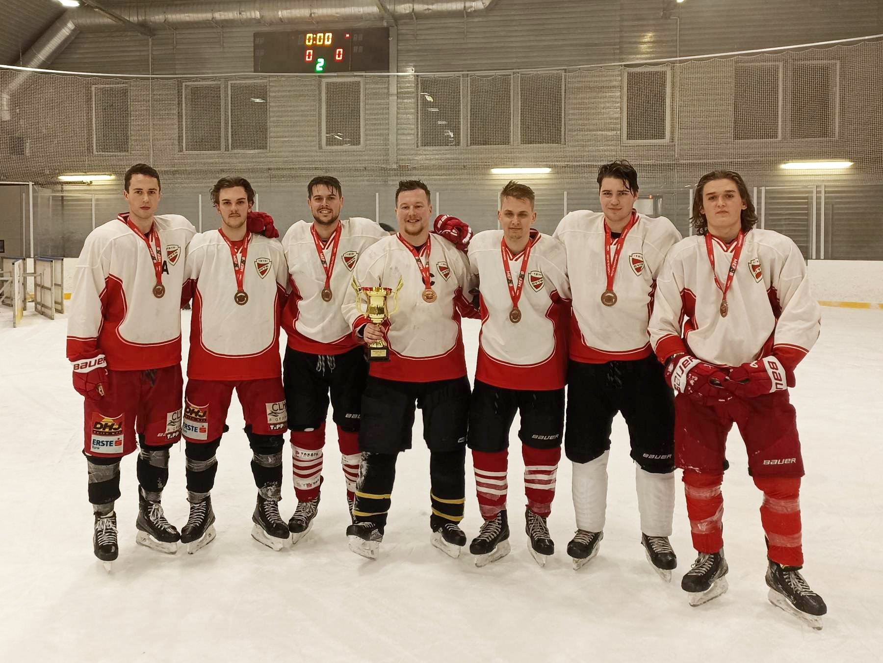A Miskolci Egyetem bronzérmes csapata: Lövei Dávid (balról), Farkas Márton, Nagy Bence, Sajó Márton, Molnár Máté, Kurys Levente és Kiss Mátyás az óbudai jégen. Fotó: Magánarchívum
