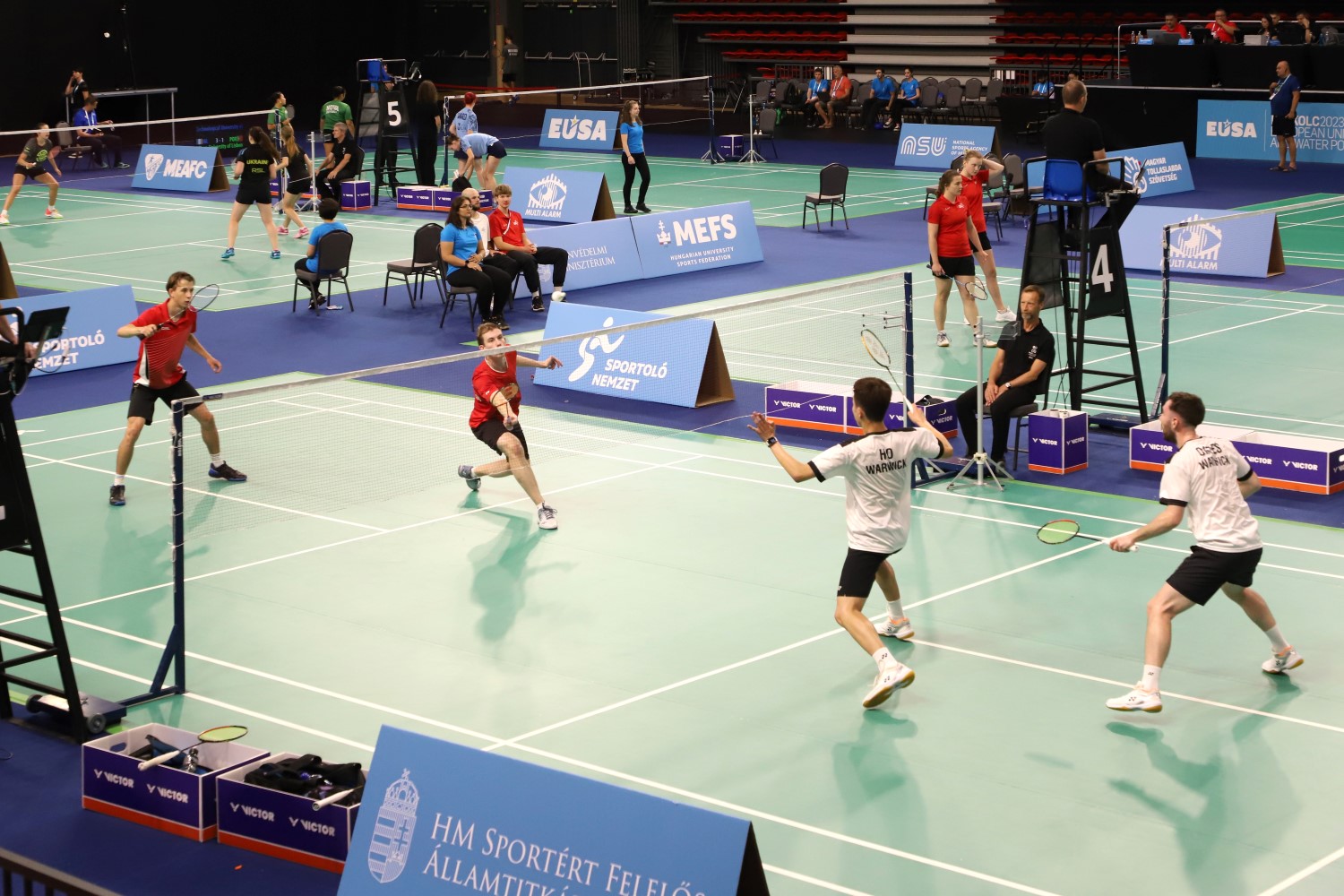 A miskolci Európai Egyetemek Tollaslabda és Vízilabda Bajnokság első versenynapja után tollasban brit fölény van kibontakozóban, míg vízilabdában a magyar fiatalok írják a forgatókönyvet.