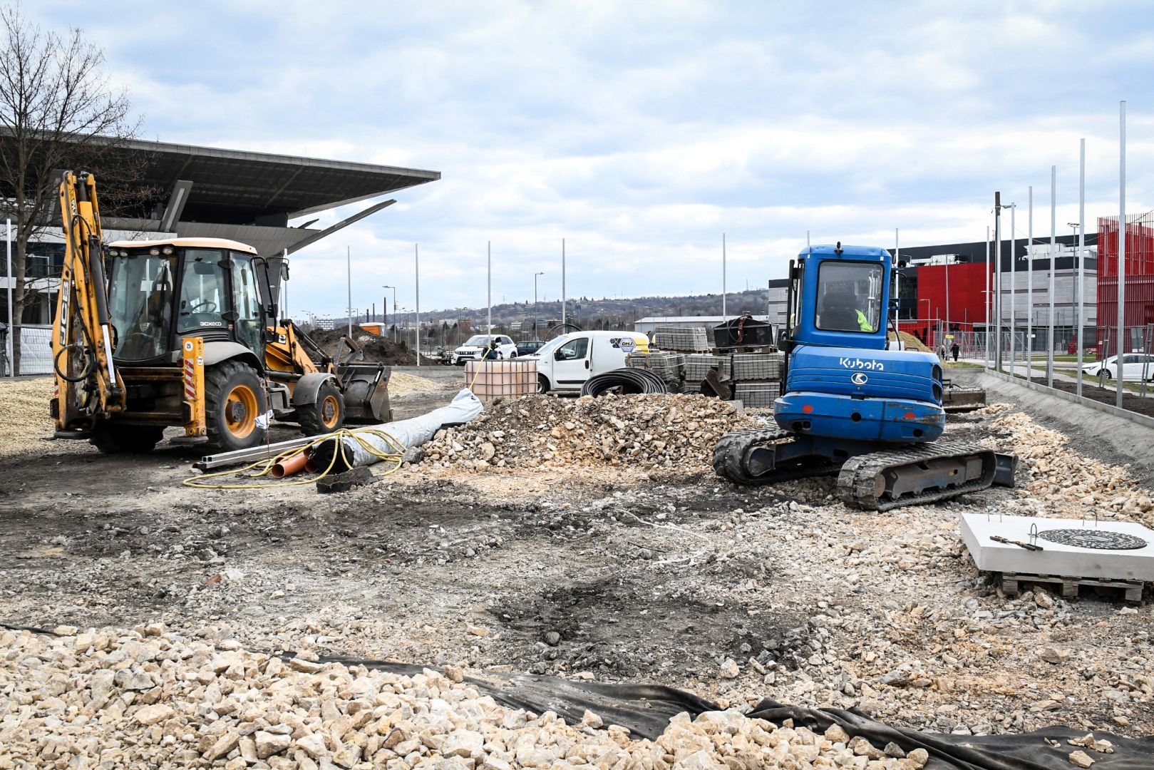 A komplexumok tőszomszédságában munkagépek dolgoznak, a kivitelezők új sportpályákat építenek.