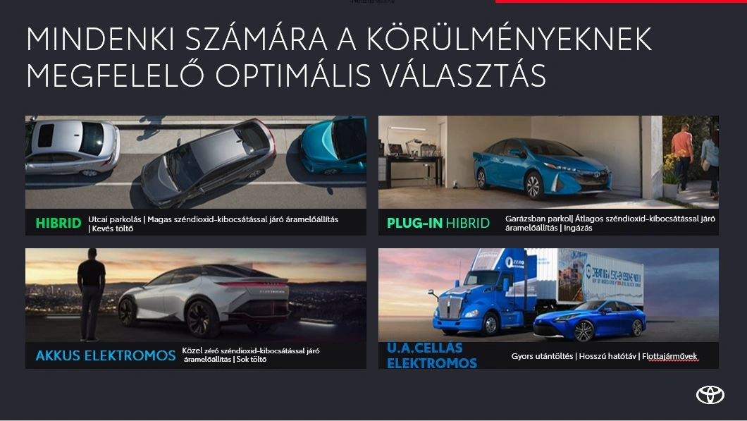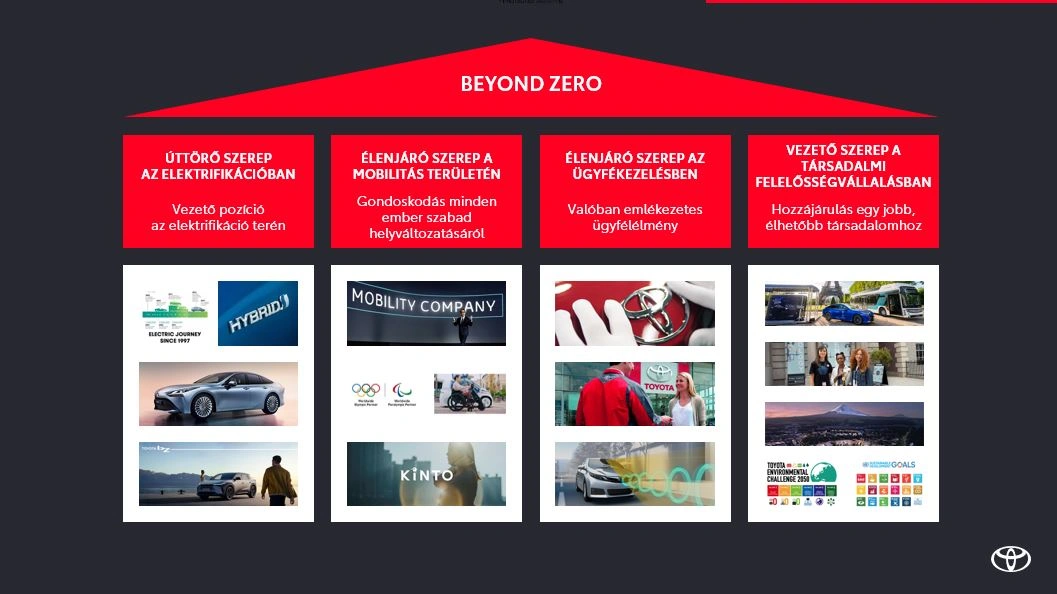 A világ legnagyobb és legzöldebb autógyártója, az Európában már 80%-ban részben vagy teljesen elektromos autókat - azaz az öntöltő hibrid elektromos, a plug-in hibrid elektromos, az akkumulátoros elektromos és a hidrogén üzemanyagcellás elektromos modelleket - értékesítő, és ezen technológiák fejlesztésében globálisan vezető szerepet betöltő Toyota Beyond Zero néven foglalja össze vállalati stratégiáját, amely az elektrifikáció és a mobilitás területén betöltött vezető szerep mellett a legmagasabb szintű ügyfélélmény és a társadalmi felelősségvállalás pilléreire támaszkodik.