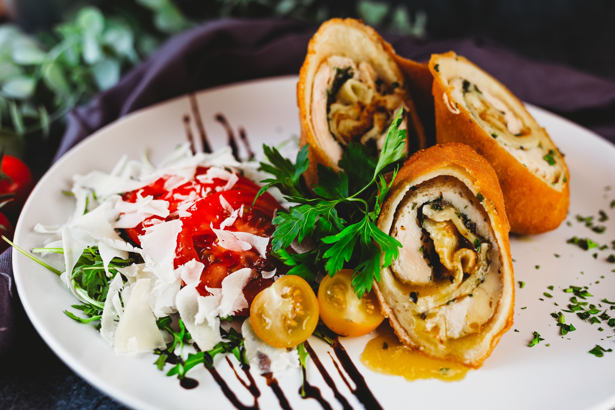 Vagy akár kényeztesd magad a Velvet palacsinta utánozhatatlan, rántott bundába zárt ízvilágával, mely fűszervajas csirkemellet rejt, balzsamos ruccolás paradicsomos salátaágyon.