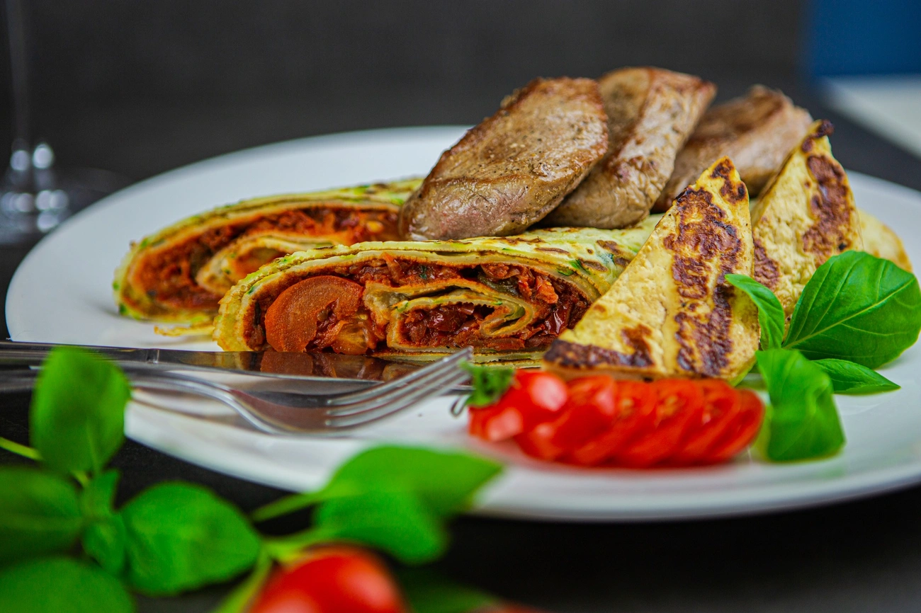 Próbáld ki az arisztokrata Príma palacsintát, roston sült szűzérmékkel, grillezett sajttal megkoronázva a cukkinis palacsintákba töltött paradicsomos-bazsalikomos raguval.