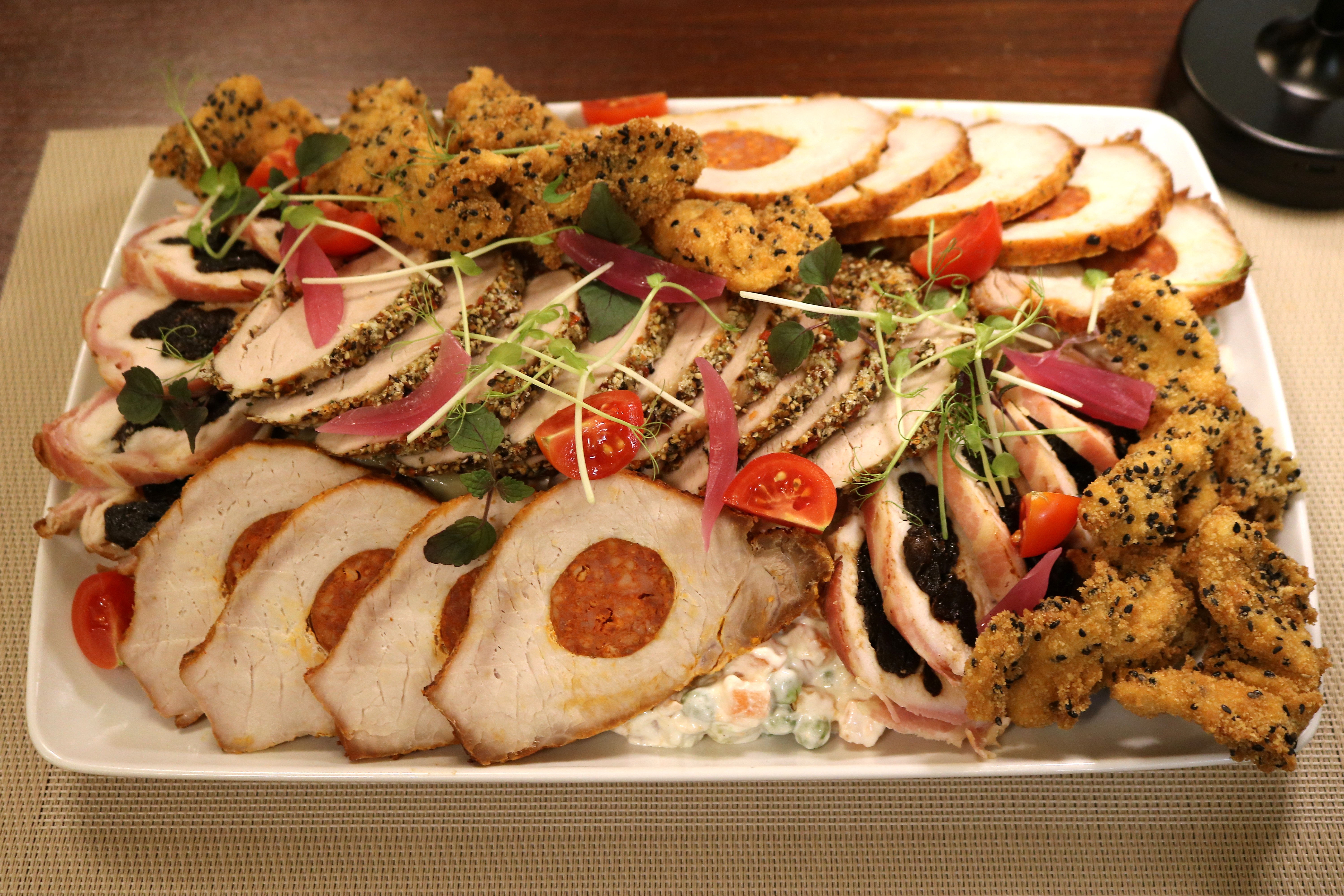 Debreceni sertéskaraj, aszalt szilvával töltött csirkemell baconbe sütve, borskéregben sült sertés szűzérme, lenmagos bundában sült csirkemell csíkok, francia saláta, bajor burgonyasaláta