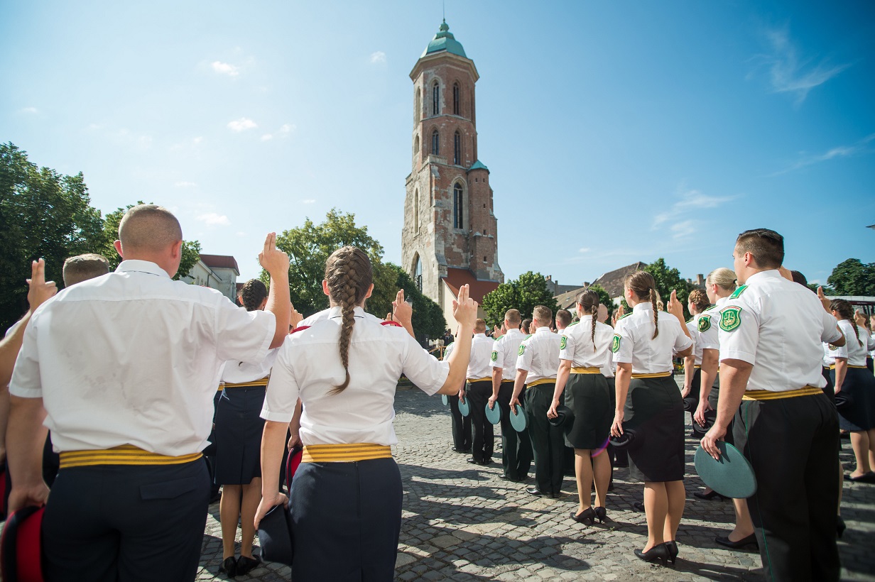Az NKE Rendészettudományi Karának 168 végzett hallgatója a Szent Korona másolata és a történelmi zászlók előtt, a miniszterelnök mellett Pintér Sándor belügyminiszter, Benkő Tibor honvédelmi miniszter és a tábornoki kar jelenlétében tette le a tiszti esküt.
