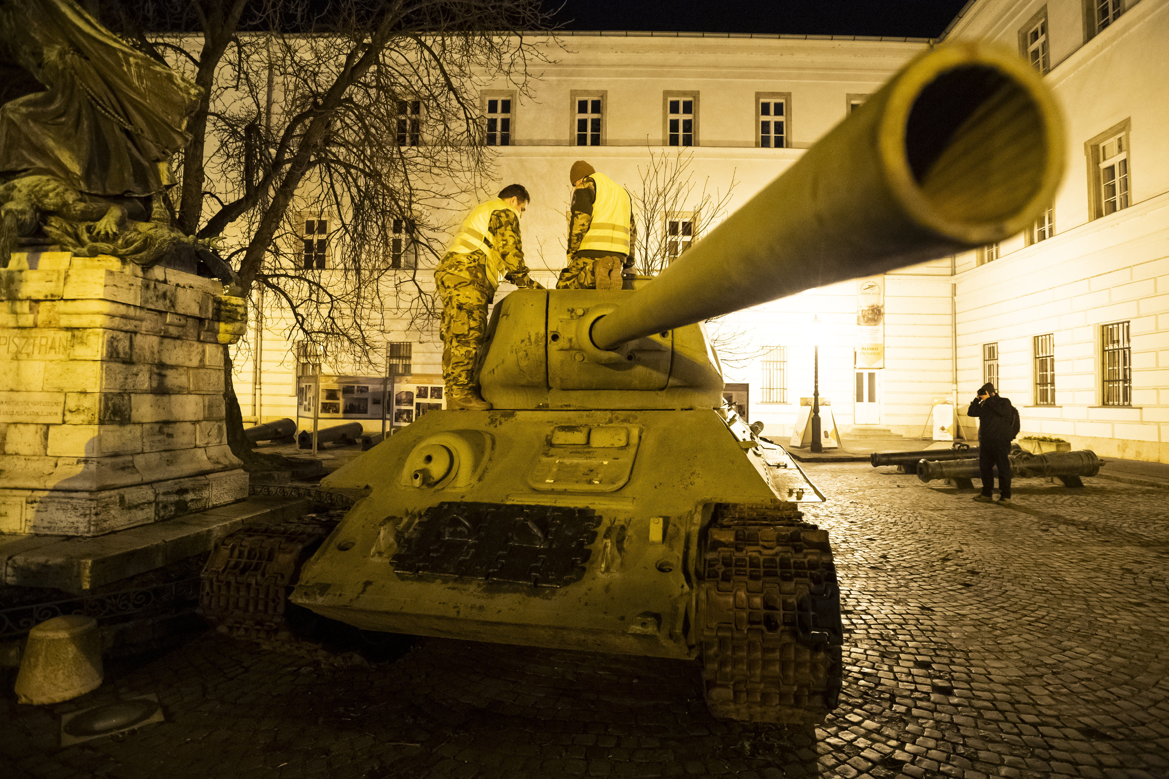 Elszállításra készítik elő a felújításra szoruló T-34-es harckocsit a budavári Kapisztrán téren - fotó: MTI