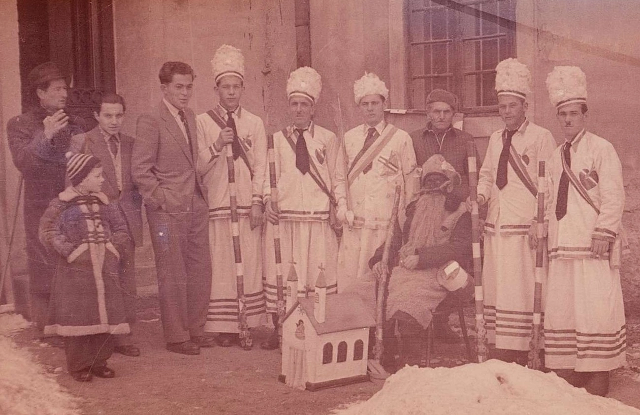 Betlehemesek csoportja a múzeum udvarán – bal oldalon mellettük állnak Lajos Árpád, Bodgál Ferenc néprajzkutatók és Kiss András tanár. Miskolc, 1956. december 27. Fotó: Bodgál Ferenc