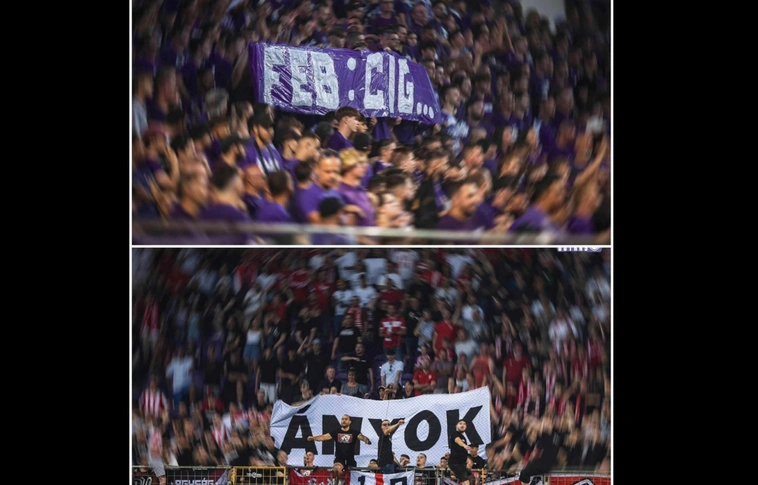Összefogtak DVTK és az Újpest szurkolói a pénteki meccsen. A közös kiállás egy-egy molinón jelent meg a hazai és a vendég oldalon.