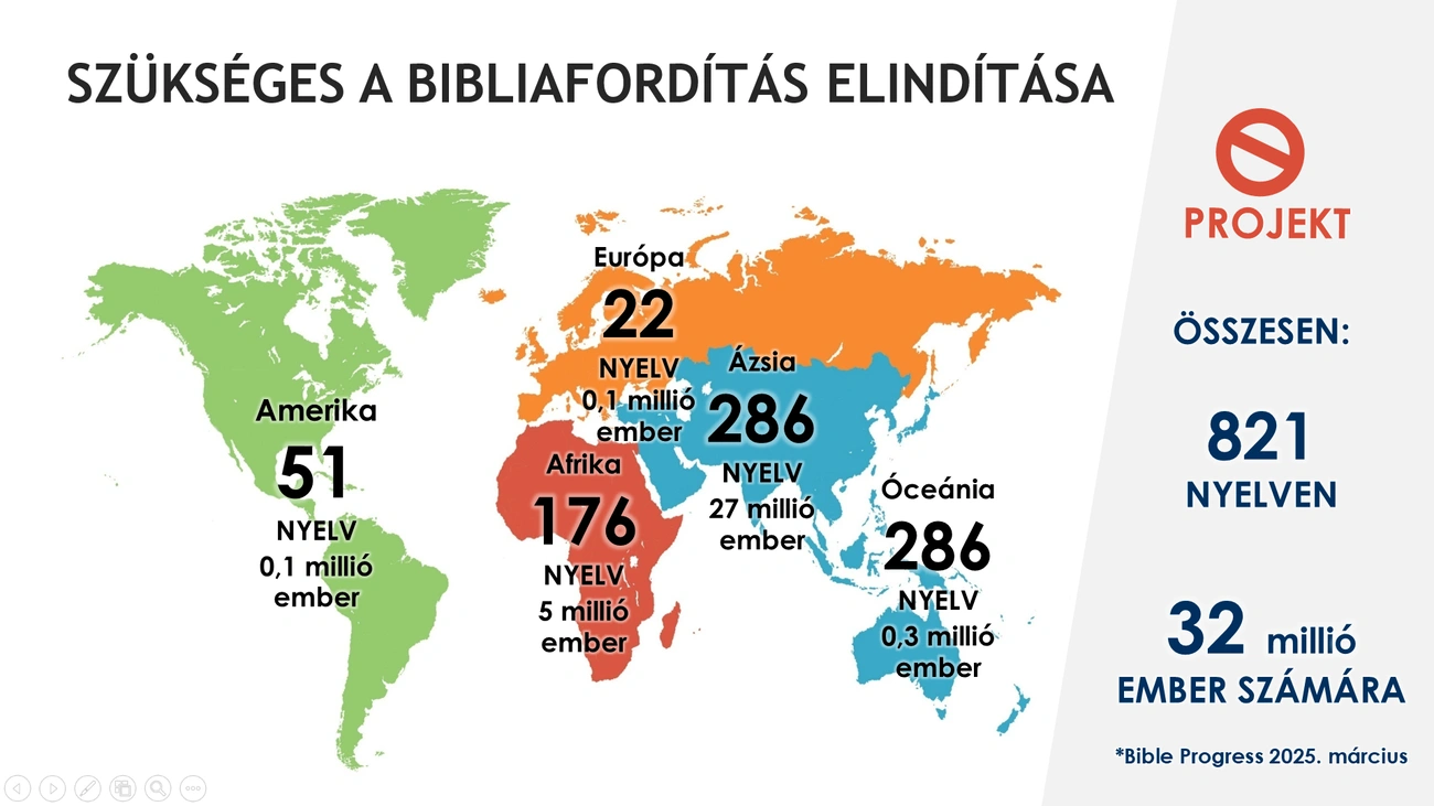 Tudatta, hogy ma körülbelül 7300 nyelvet beszélnek a világon, amelyek közül eddig mindössze 771-re fordították le a teljes Szentírást. A Bibliának legalább egy részletéhez a Föld lakosságának mintegy 98 százaléka fér hozzá. Az ázsiai országokban van hátra a legtöbb elvégzendő feladat. Európában, ahol a legnagyobb a lefedettség, elsősorban a roma és a jelnyelveken szükséges még fordítás.